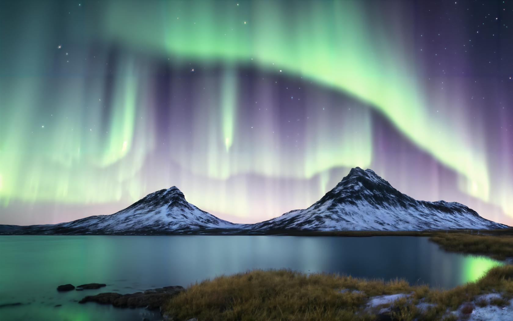 mountain in the middle of the night with aurora lights lite above it and a body of water under it on a plain with an almost bare, green grass area of land