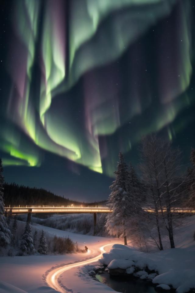 Prompt no humans, snow, night,aurora borealis,starry sky