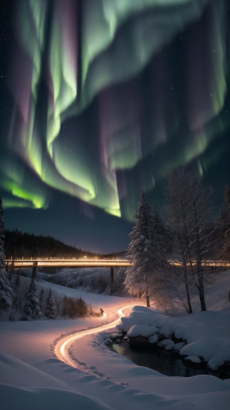 a train goes past lights illting aurora bore on its way up the mountain side past snow covered trees and branches of a stream with a trail