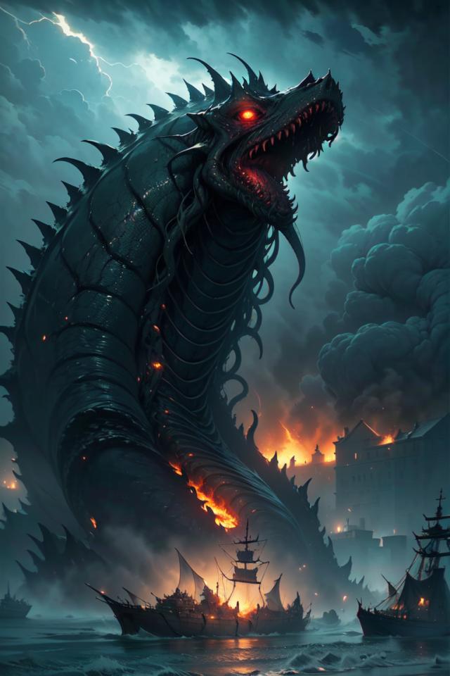 Prompt <lora:Cthulhu_monster:0.3> ((three quarters view of a howling creepy giant eldritch monster rising from the raging sea)), ,(((giant tentacles))), (wings,scales,cthulhu), creepy aberrant nightmare birds flying to viewer, ((malestrom, vortex)), dark clouds, (lightnings), ((populated lit harbor far away,burning tiny sinking ships,fishers' town,mist)),