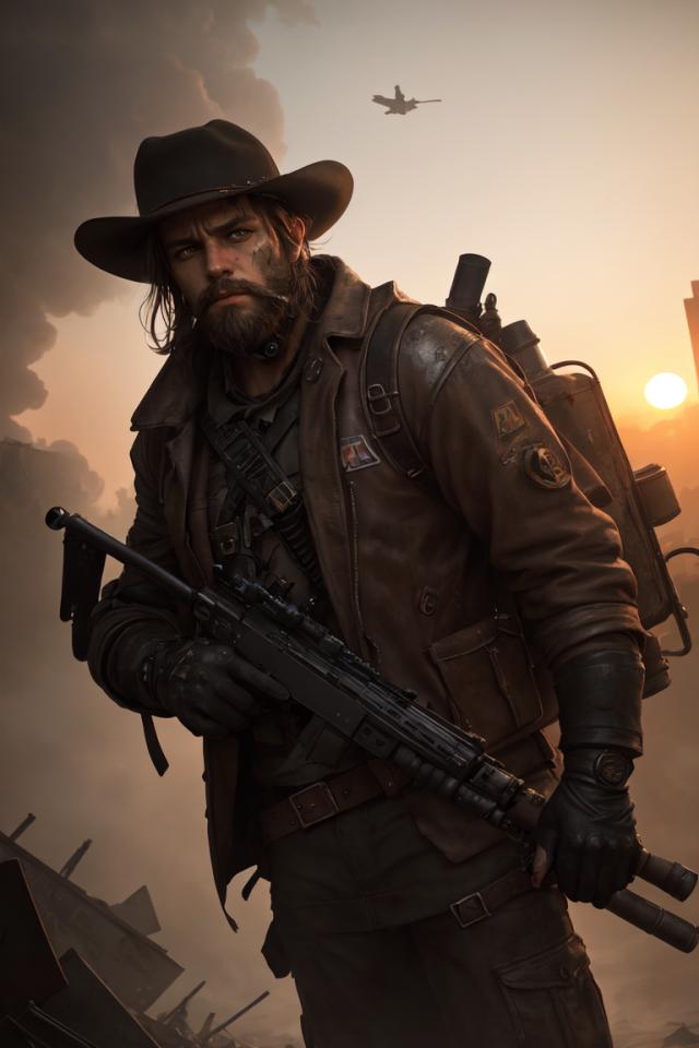 | Prompt | close view of 1boy,long ((torn)) leather coat,three days beard,tired, cowboy hat,gloves,