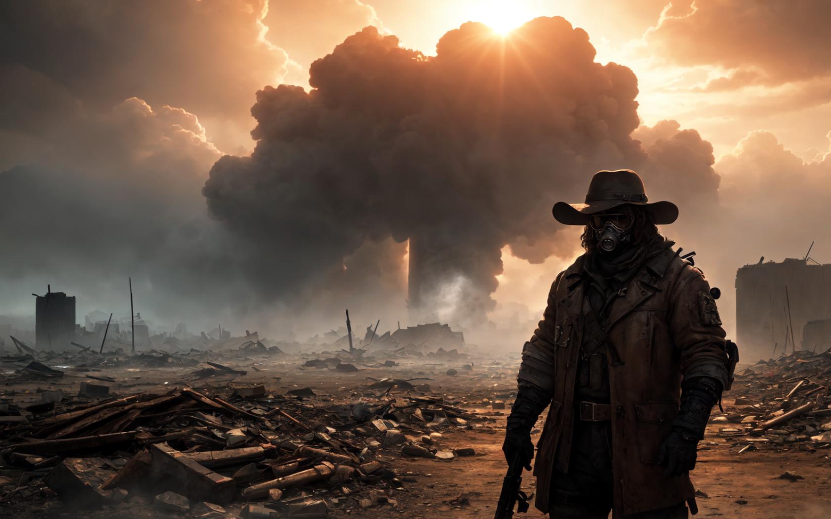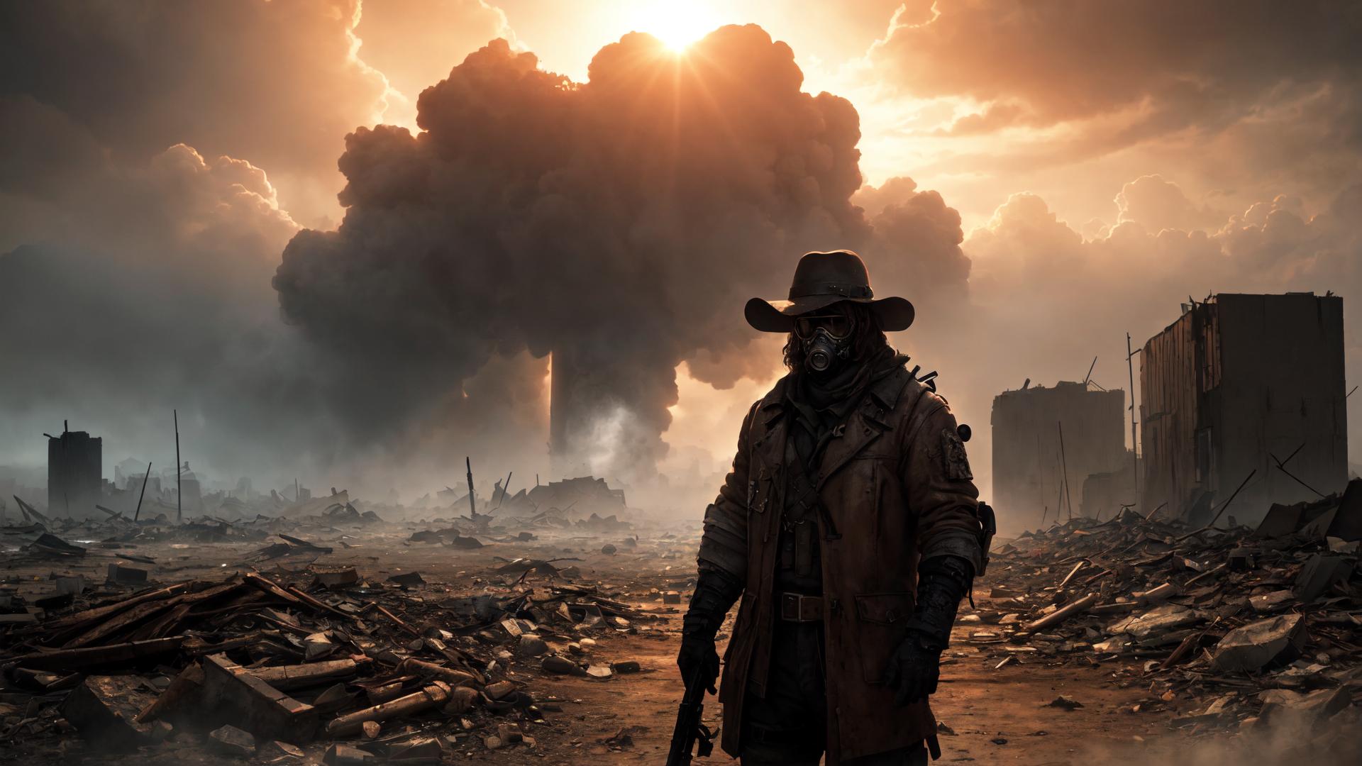 | Prompt | close view of 1boy,long ((torn)) leather coat,three days beard,tired, cowboy hat,gloves,