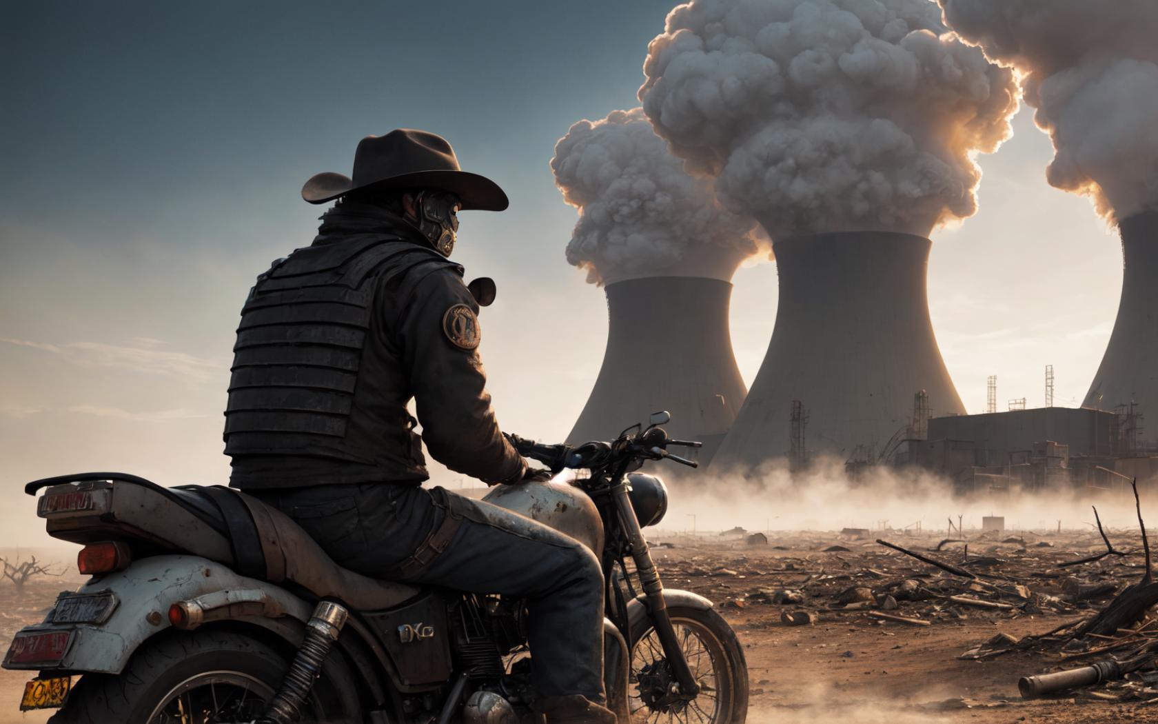 a biker sitting on a motorcycle in front of reactor towers and smoke billowing out of the chimneys of power plants behind them on a dirt field