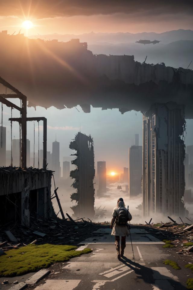 | Prompt | three quarters view of a woman walking in desolated skyscraper city ruins, solo,