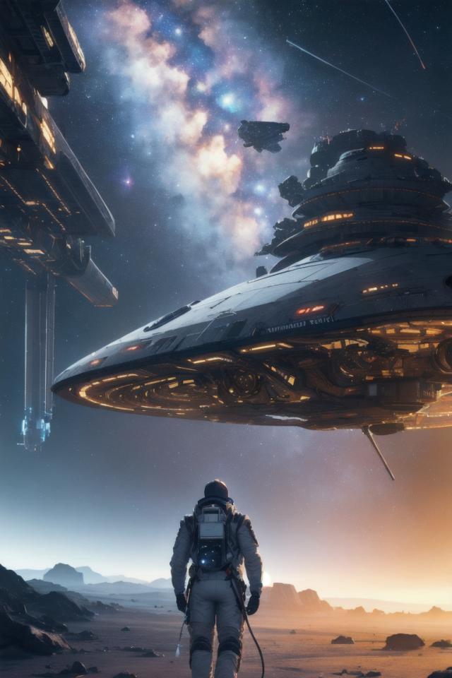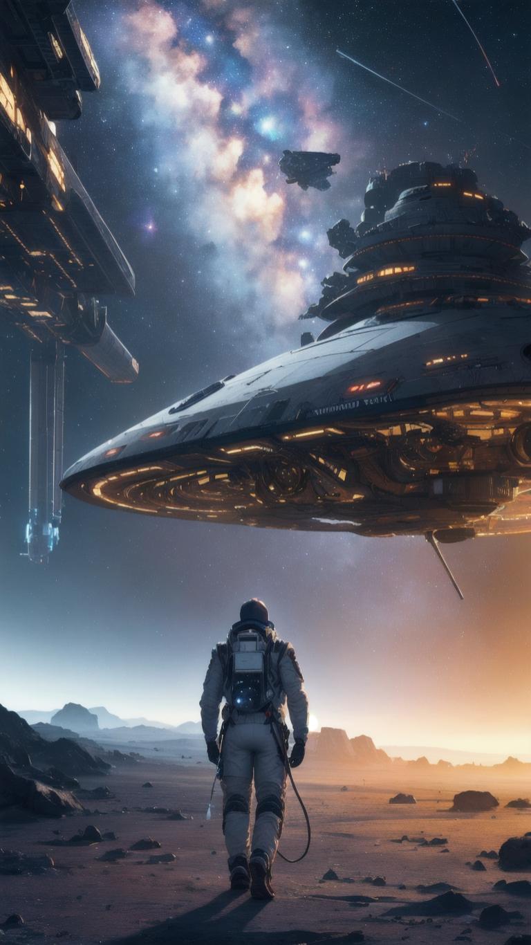 | Prompt | portrait of 1boy wearing a spacesuit,walking on a desolated planet, ((spaceship, landing gear)), ((dark night,nebula)),milky way,galaxy,starry sky,