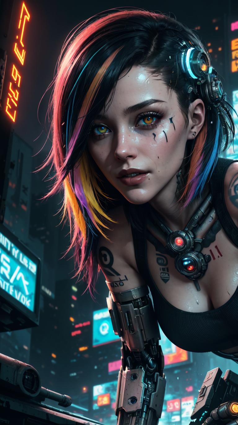 (body tatoos),((long multicolored hair)),heterochromia,cybernetic eye,