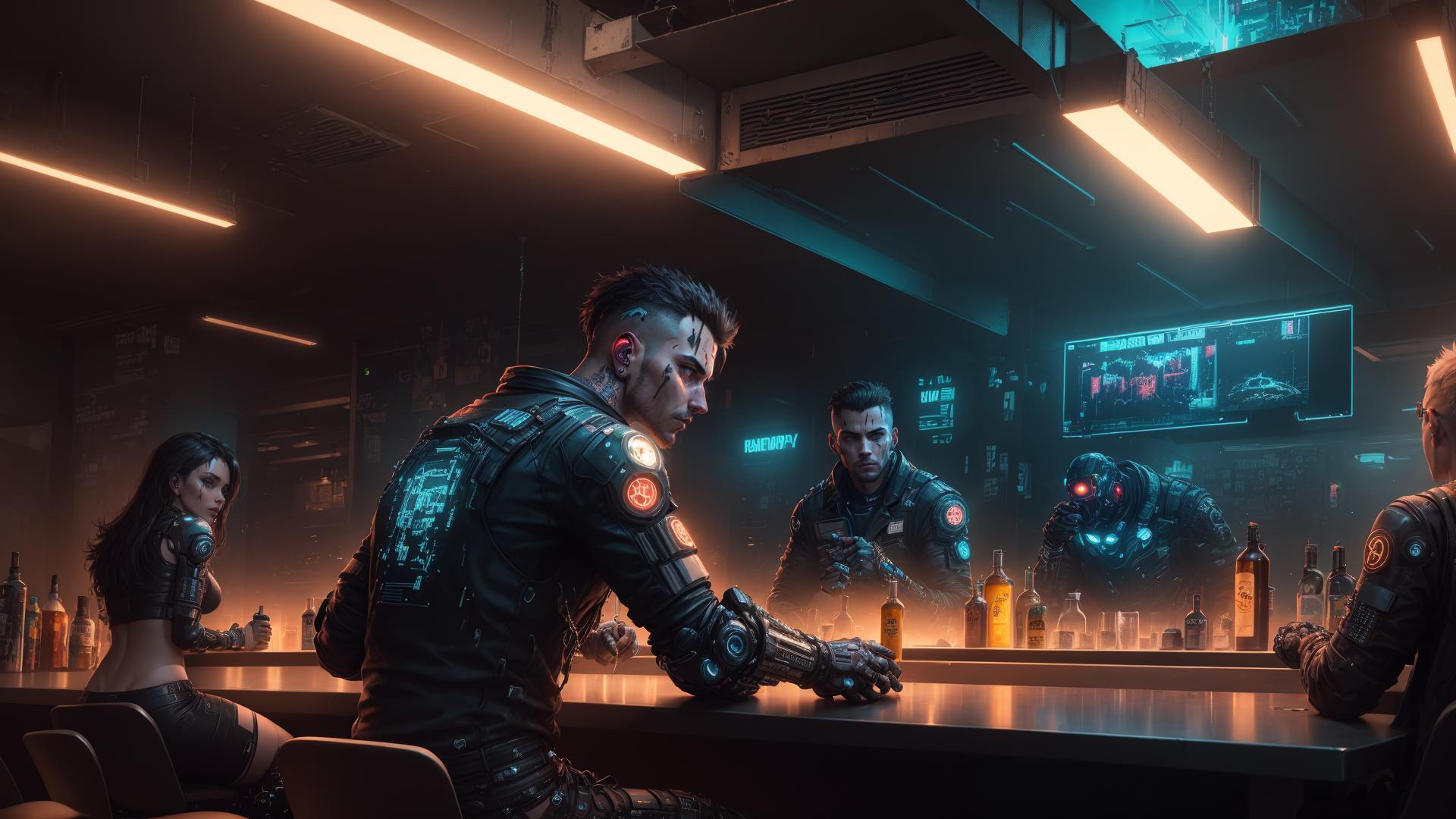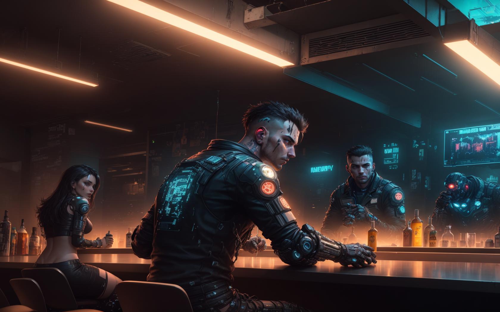| Prompt | cyberpunk man sitting behind a futuristic ((crowded)) bar,cyborg,cyborg customers,