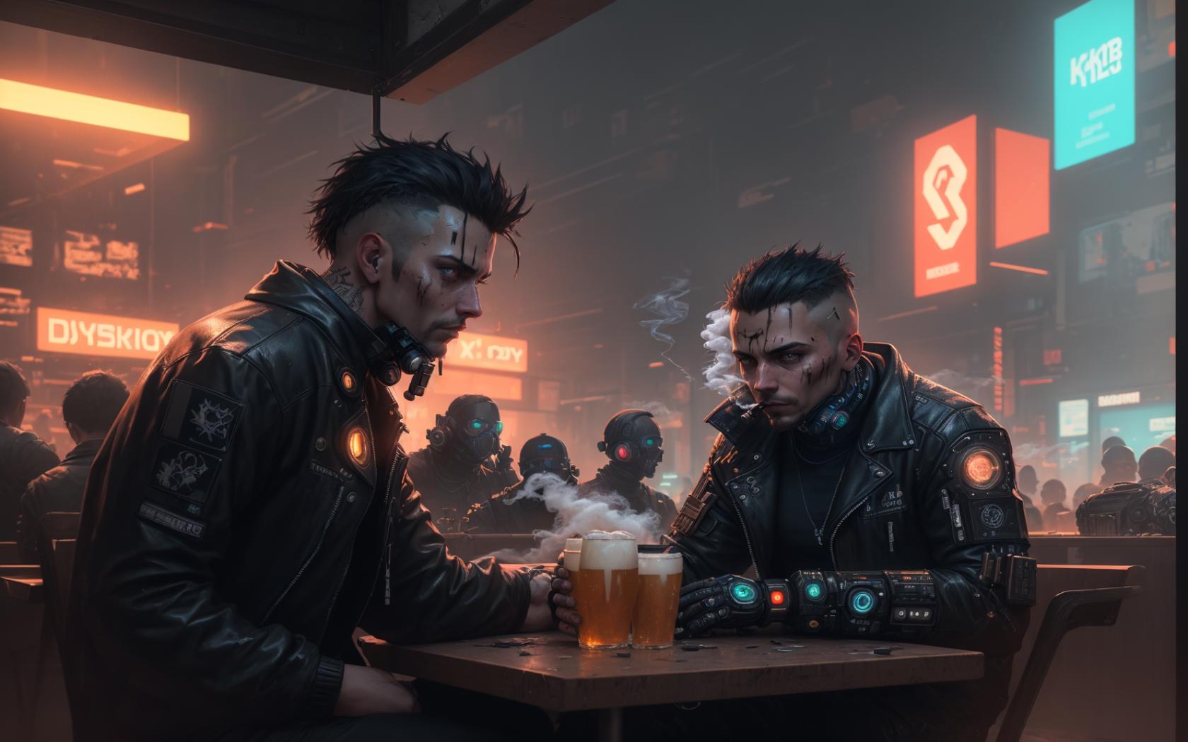 6+boys, alcohol, bar (place), beard, beer, beer mug, black hair, black jacket, cigarette, crowd, cup, cyberpunk, cyborg, facial hair, holding, jacket, male focus, mohawk, mug, multiple boys, neon lights , scar, scar across eye, scar on face, science fiction, short hair, sitting, smoking, table, undercut