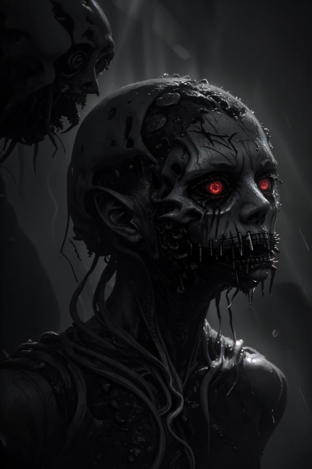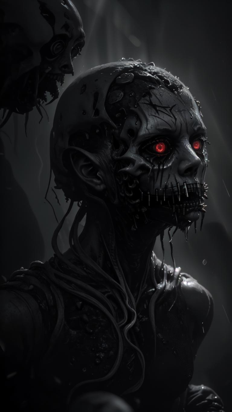a close up view of a creepy looking creature in the dark with red eyes and head full of bones on his arm, with dark background