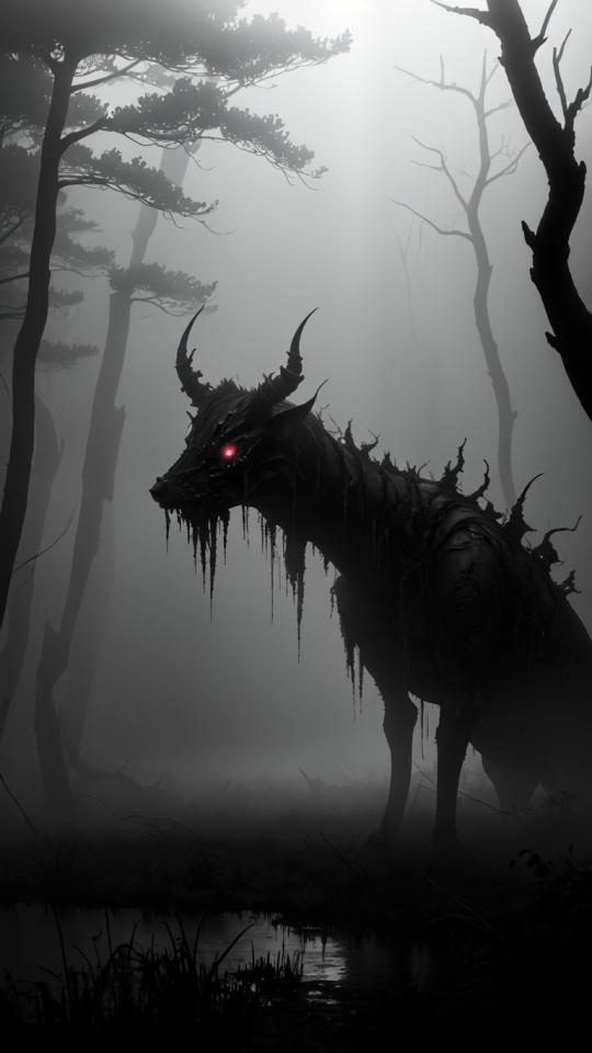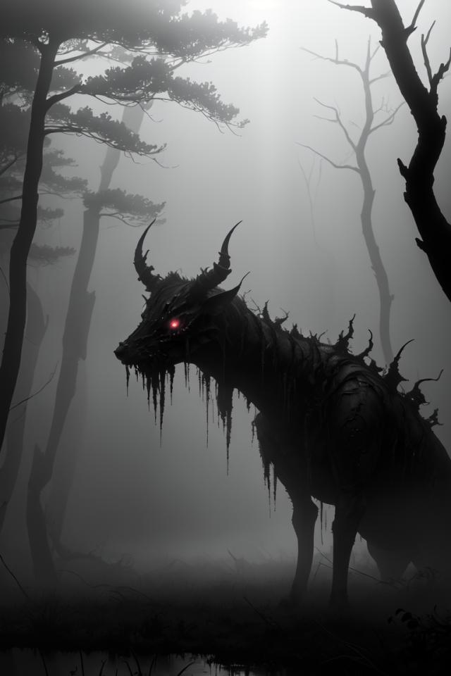 | Prompt | (translucid , transparent, blurry,made of mist,ethereal devil creature), glowing red aura,