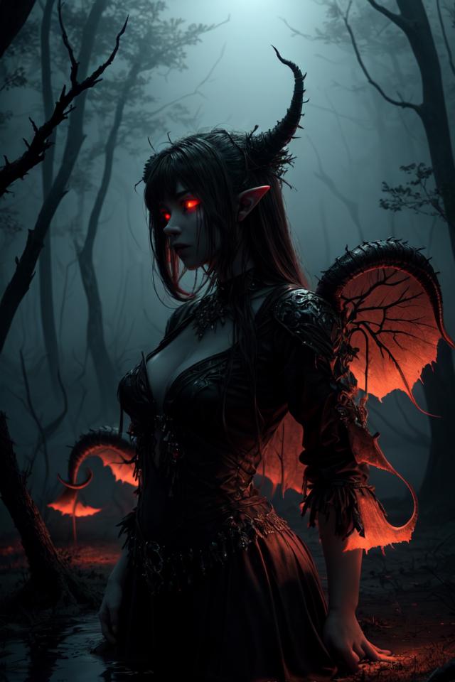 | Prompt | (translucid , transparent, blurry,made of mist,ethereal devil creature), ((glowing red aura, rift to hell from where emerge demoniac creatures)),