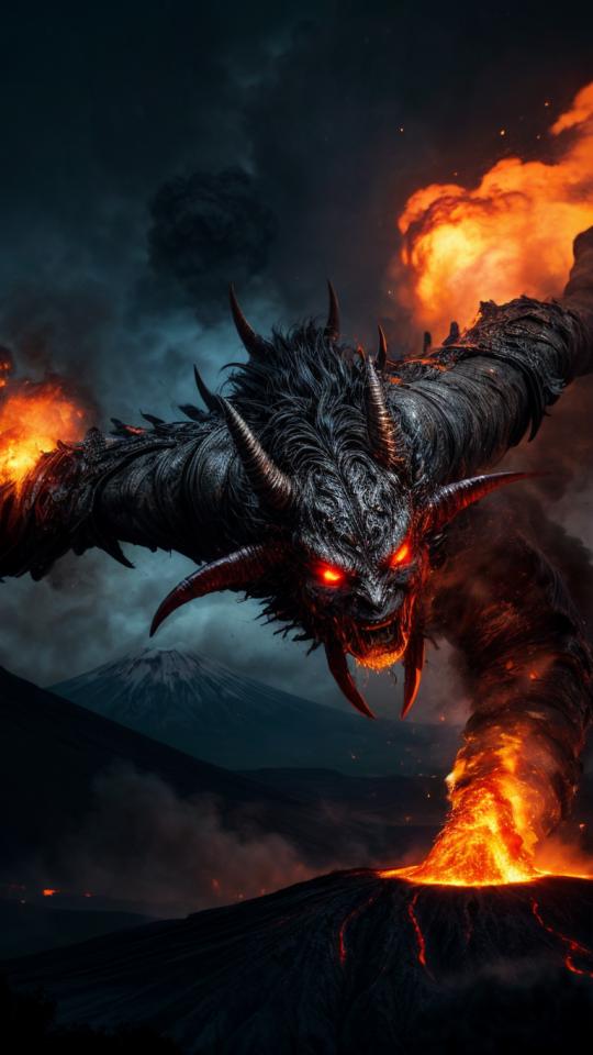 hell, hellish landscape background,flames,smoke,volcano eruption,meteors, flaming meteors falling from the sky,