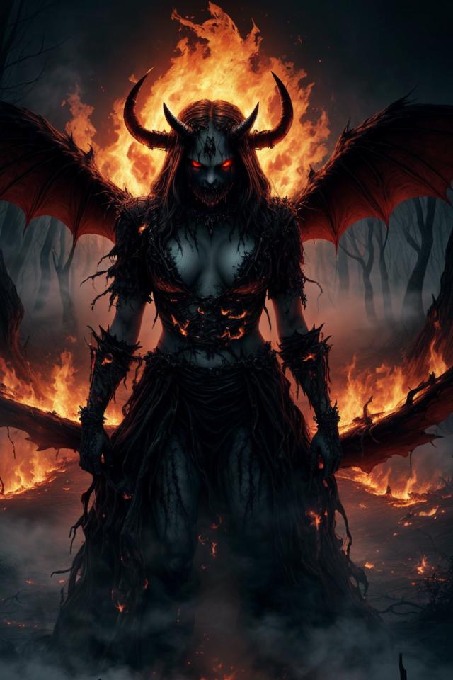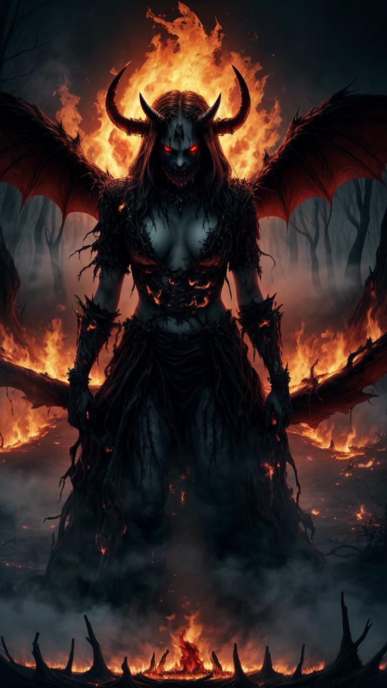 | Prompt | (devil with glowing red eyes,wings,horns,emerging from the mist), ((glowing red aura, gigantic gate to hell, rift from hell)),