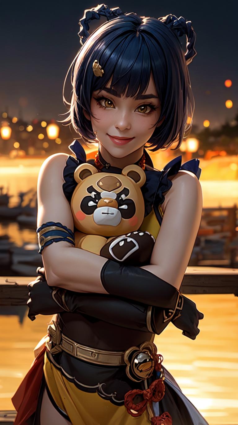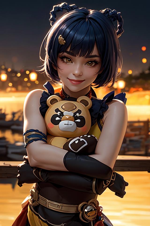 Prompt <lora:xiangling1:1>xianglingdef, (cute, kawai:1.3),(smiling), medieval chinese harbor background, sunset, fireworks, flying lanterns,