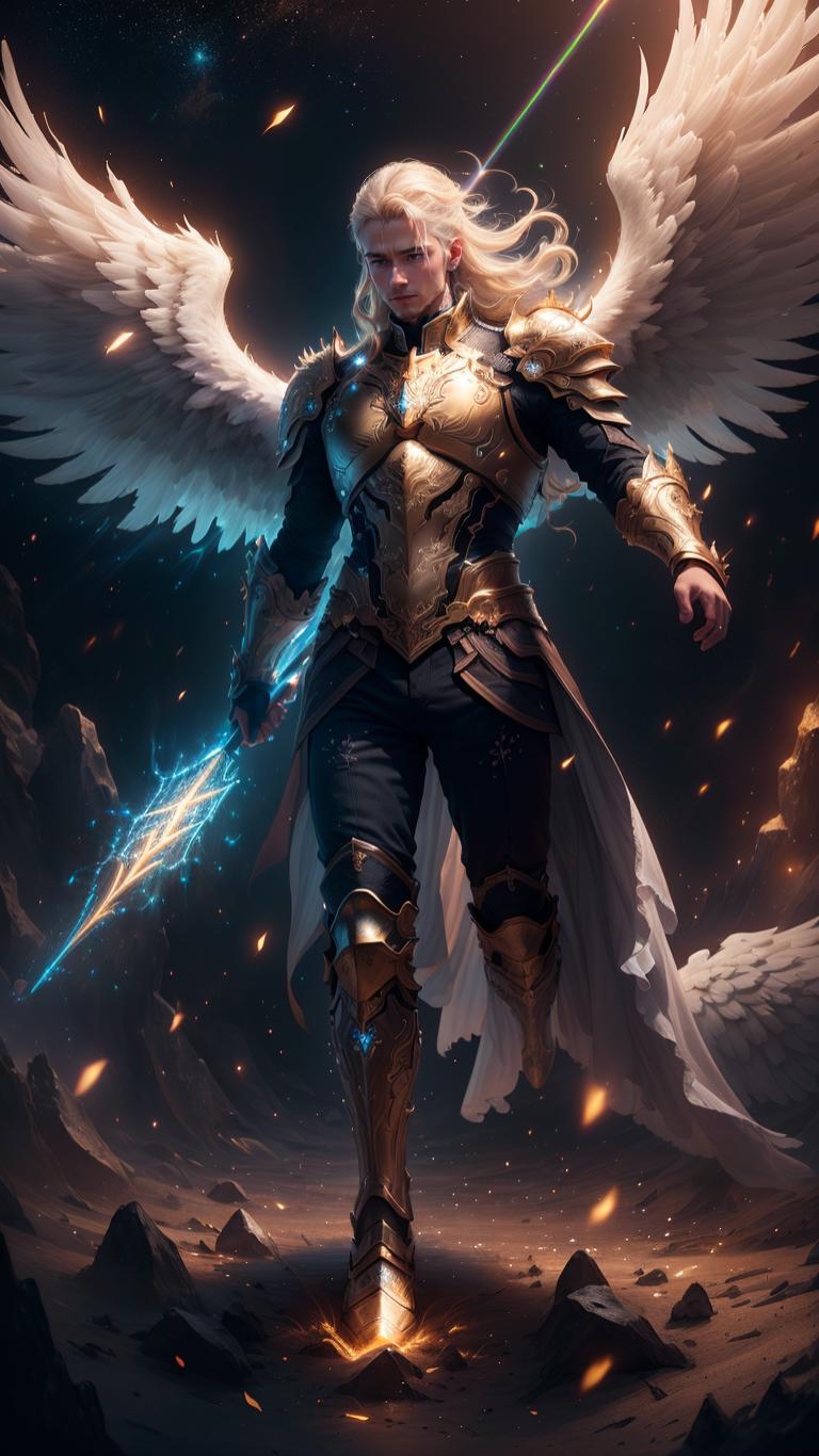 1boy, angel, angel wings, armor, armored boots, black pants, blonde hair, blue eyes, boots, breastplate, embers , feathered wings, full body, glowing, glowing weapon, holding, holding sword, holding weapon, long hair, looking at viewer, male focus, pants, pauldrons, rock, shoulder armor, solo, standing, sword, weapon, white wings, wings