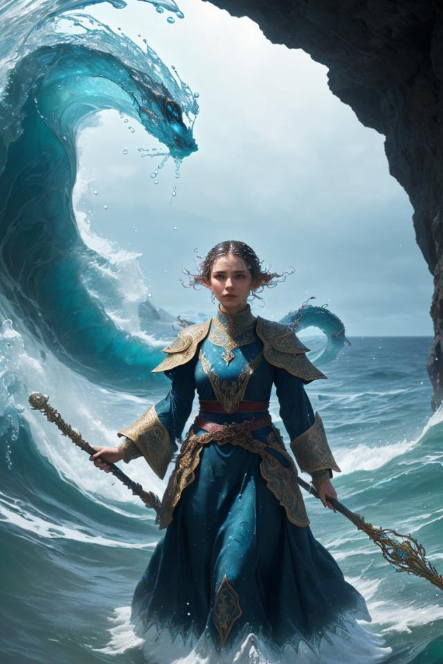 (flying translucid liquid ethereal sea serpents made of water at background),