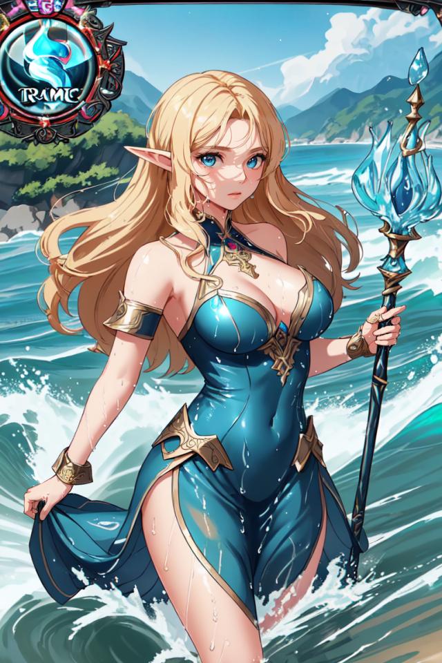 | Prompt | close view of powerful elf priestess emerging from the ((raging sea,waves, wet)),