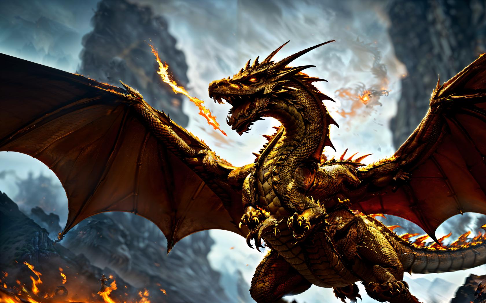 Prompt huge golden dragon ((flying)) towards viewer,above viewer head, ((dragon focus)), breathing fire, no humans, dramatic pov, dutch angle, flames, fire,