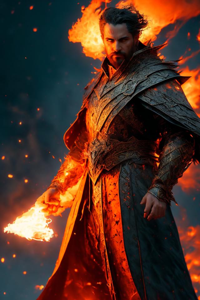 1boy, armor, beard, black hair, burning , cape, embers, facial hair, fire, looking at viewer, male focus, mustache, red eyes, solo, standing