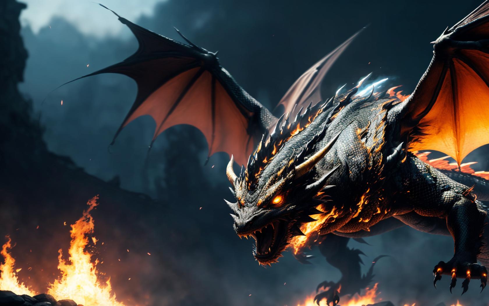 | Prompt | huge black dragon flying towards viewer,above viewer head,