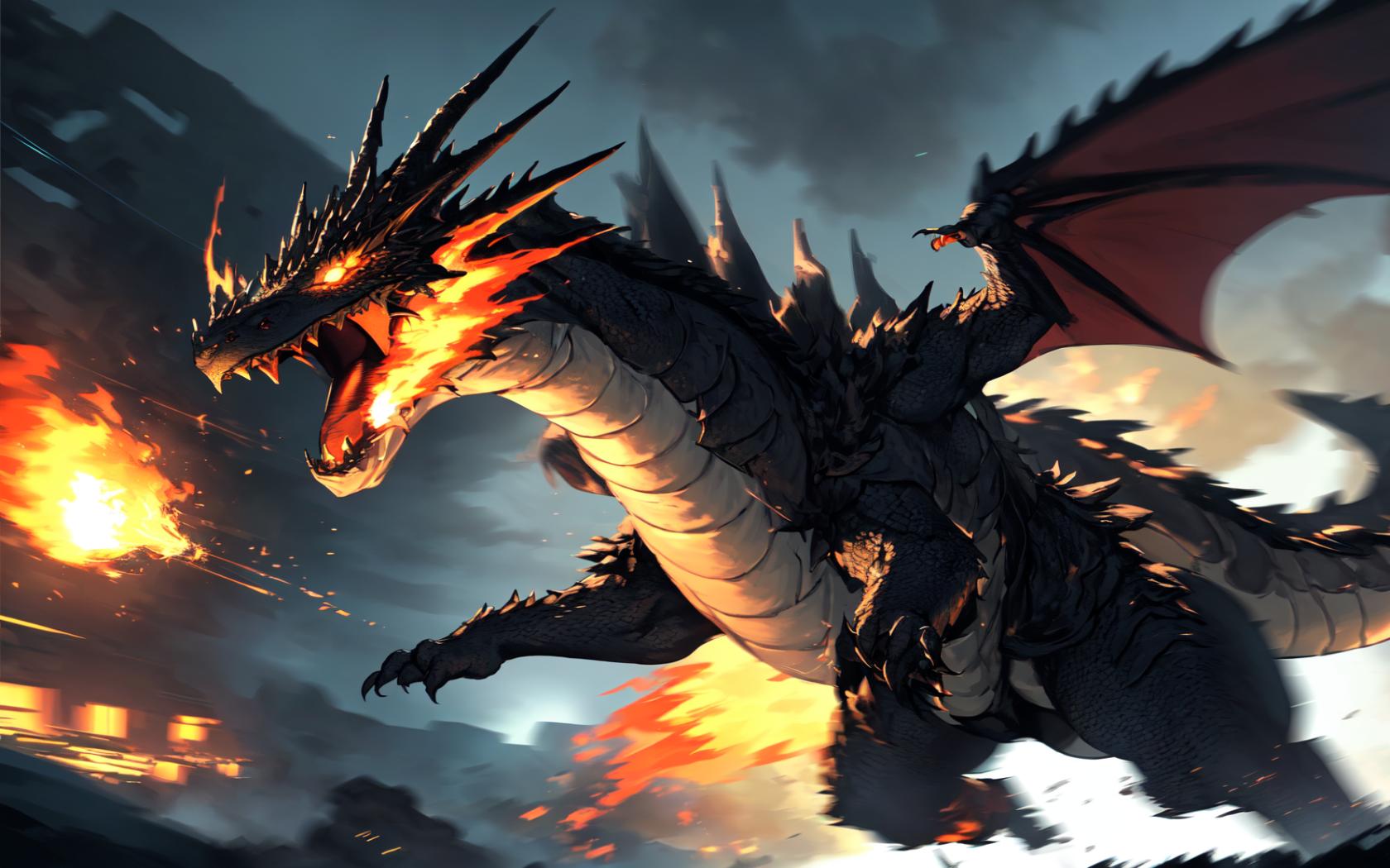 | Prompt | huge black dragon flying towards viewer,above viewer head,