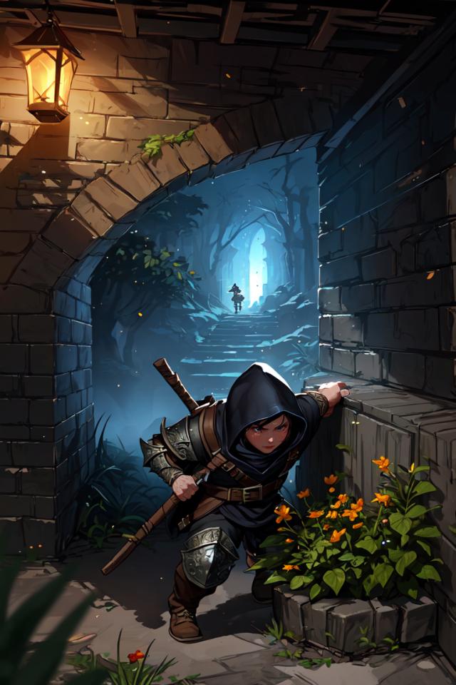 | Prompt | tiny rogue gnome, ((hidding in the shadows behind a wall)),
