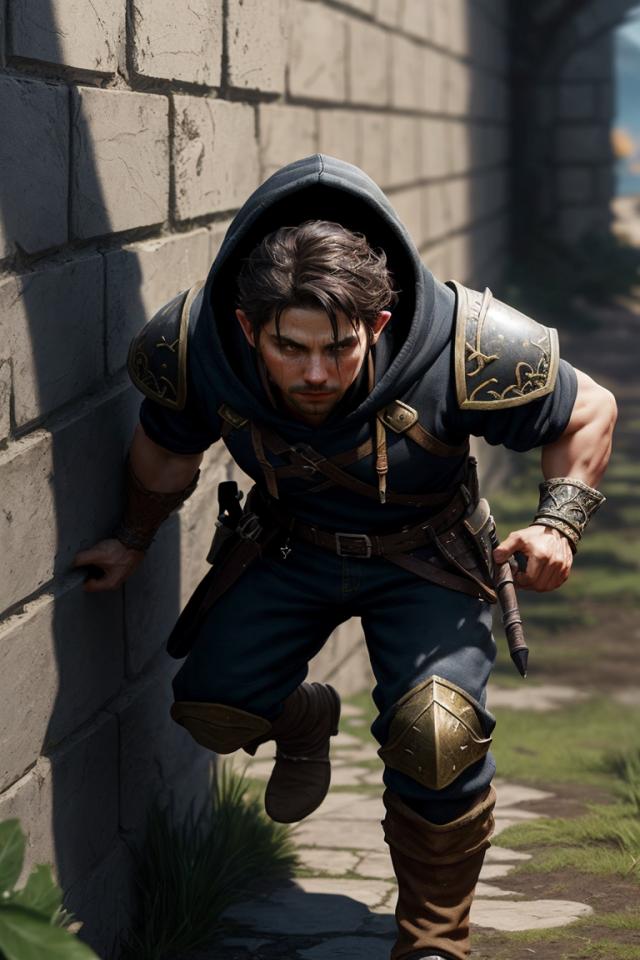 | Prompt | tiny rogue gnome, ((hidding in the shadows behind a wall)),
