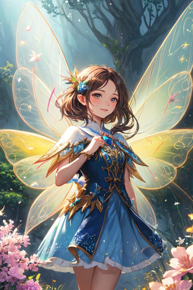 1girl, bangs, blue dress, blue eyes, blush, bracelet, brooch, brown eyes, brown hair, butterfly wings , dress, fairy, fairy wings, feet out of frame, flower, forest, frills, hair ornament, hand on own chest, hand up, jewelry, looking at viewer, nature, outdoors, parted bangs, pink flower, short sleeves, smile, solo, standing, tree, wings