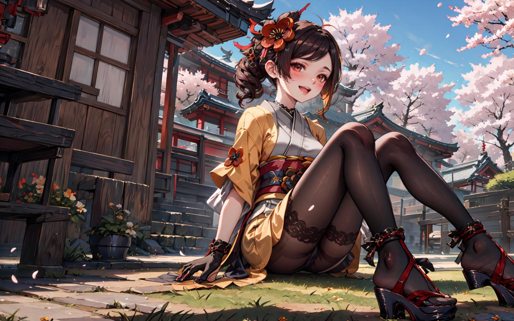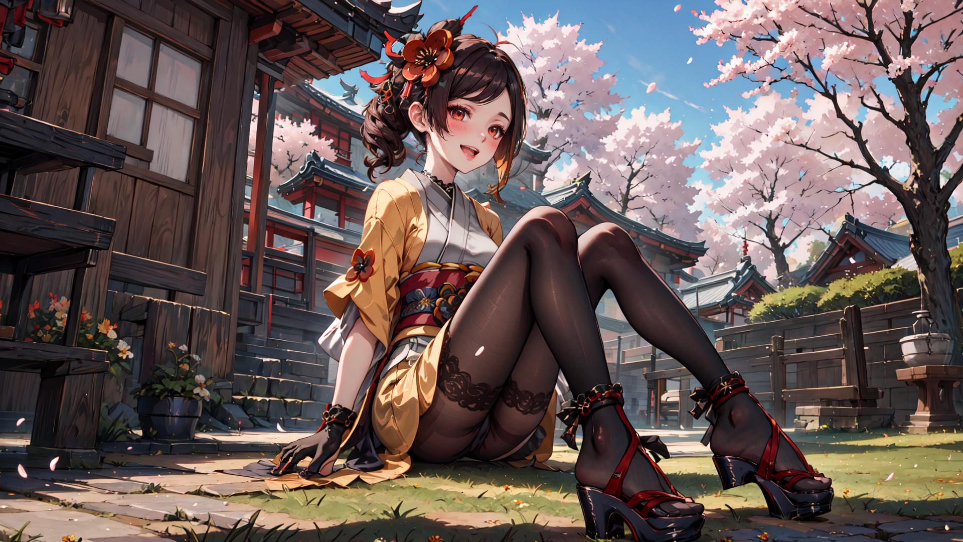 1girl, :d, architecture, arm support, ass, bangs, black footwear, black gloves, black hair, black pantyhose, blue sky, blush, brown hair, building, cherry blossoms, day, east asian architecture, fingerless gloves, floral print, flower, full body, gloves, grass, hair flower, hair ornament, high heels, japanese clothes, jewelry, kimono, knees up, lace trim, legs, long hair, long sleeves, looking at viewer, obi, open mouth, outdoors, panties, panties under pantyhose, pantyhose, parted bangs, petals, plant, platform footwear, red eyes, sandals, sash, shrine, sitting, sky, small breasts, smile, solo, stairs, stone lantern , swept bangs, tassel, thighband pantyhose, tree, underwear, upper teeth only, white kimono, white panties, wide sleeves