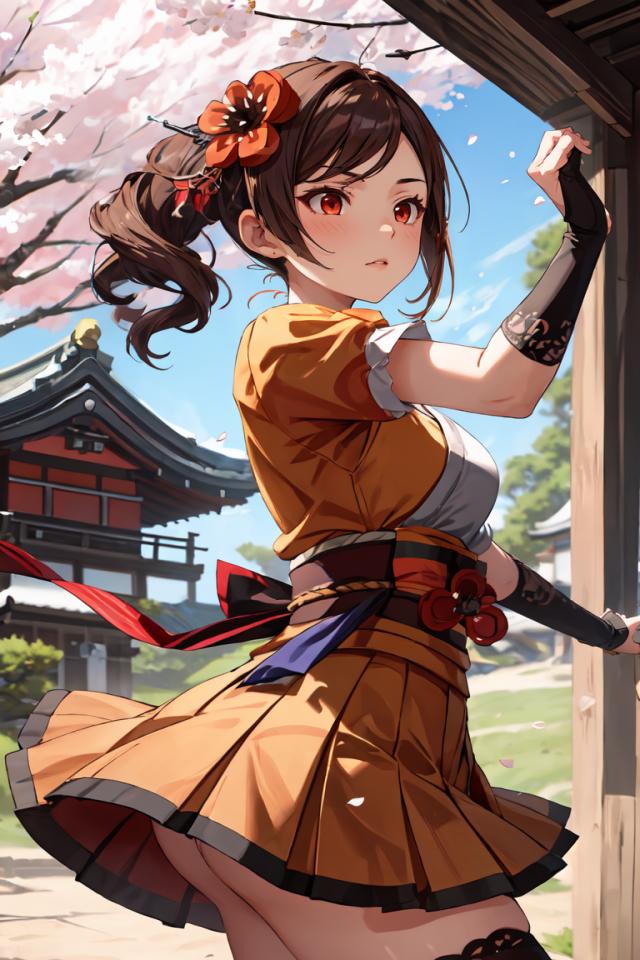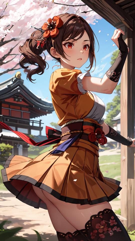 | Prompt | <lora:chiori:0.8> chiori, 1girl, brown hair, drill hair, hair ornament,hair flower, flower, red eyes, elbow gloves,short sleeves,wide sleeves, japanese clothes, kimono, pleated skirt,dress, black thighhighs,