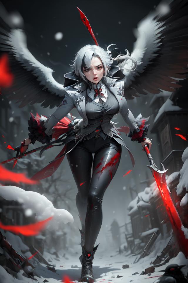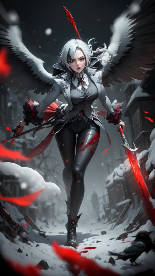 1girl, black hair, black pants, black wings, blood, blood on clothes, blood on face, blood on weapon , boots, dual wielding, feathered wings, full body, gloves, holding, holding sword, holding weapon, looking at viewer, multicolored hair, pants, red eyes, single wing, solo, sword, torn clothes, walking, weapon, white hair, wings