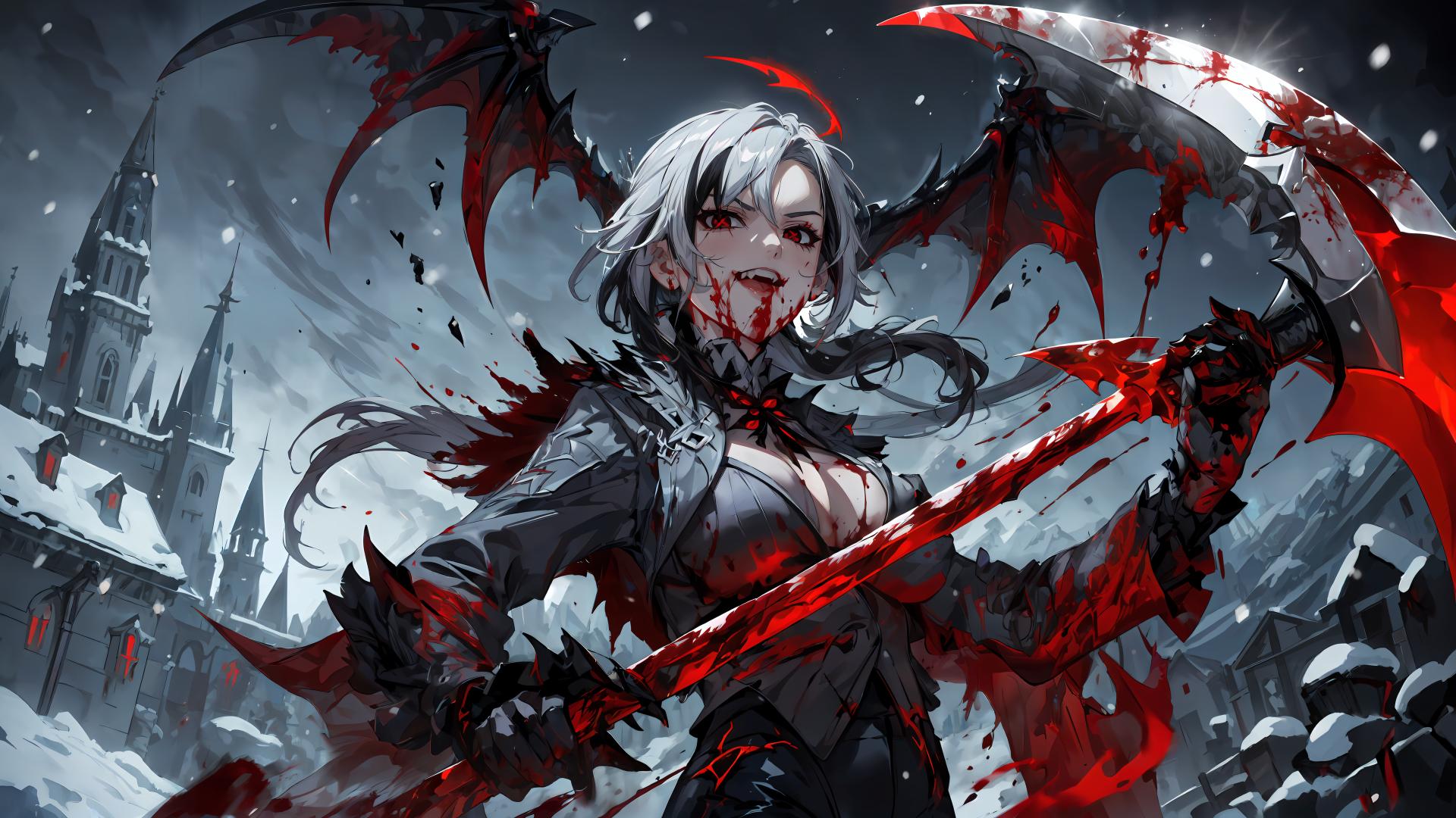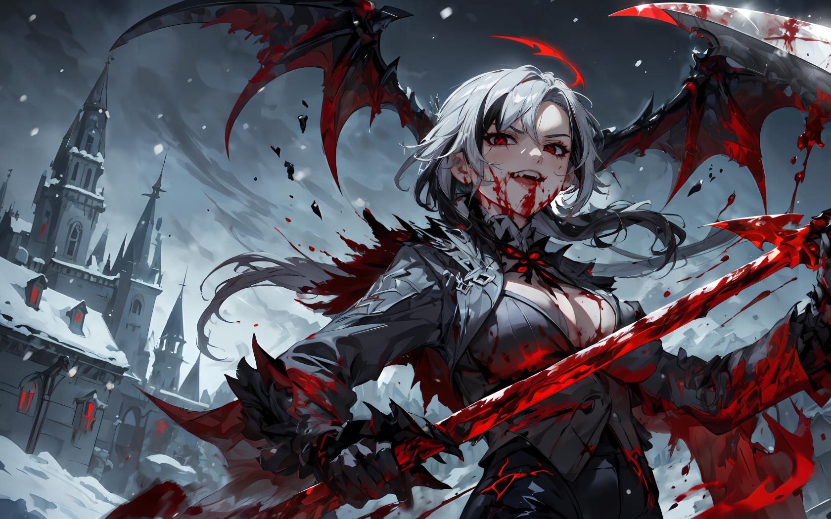 (((blood))),(holding detailed death reaper's bloody red scythe at foreground, red succubus wings wide open:1.3),