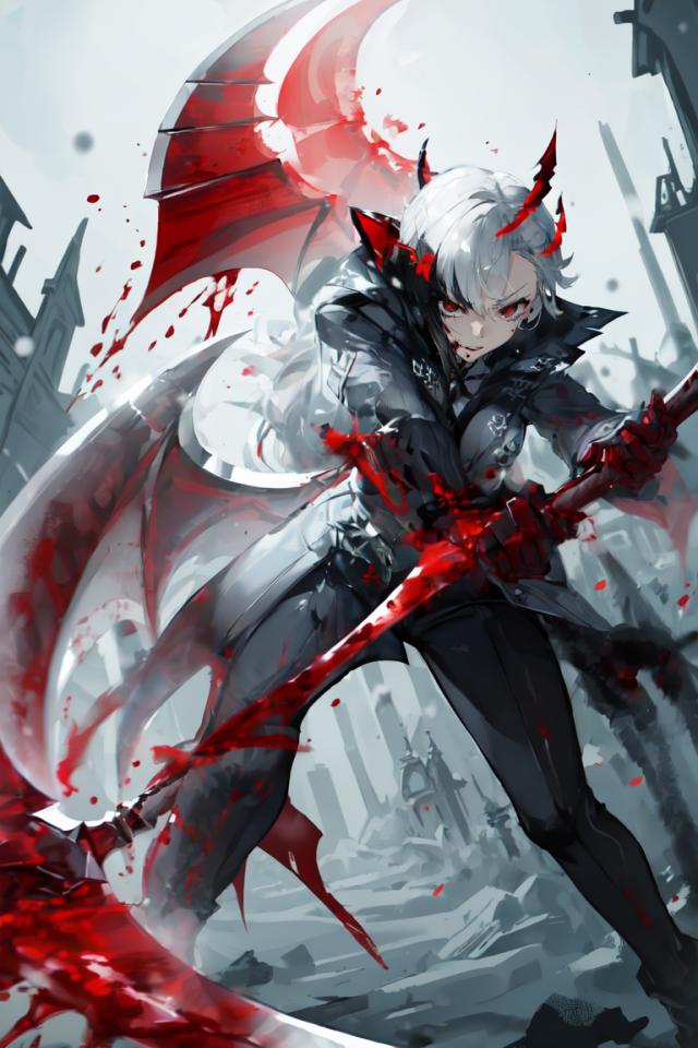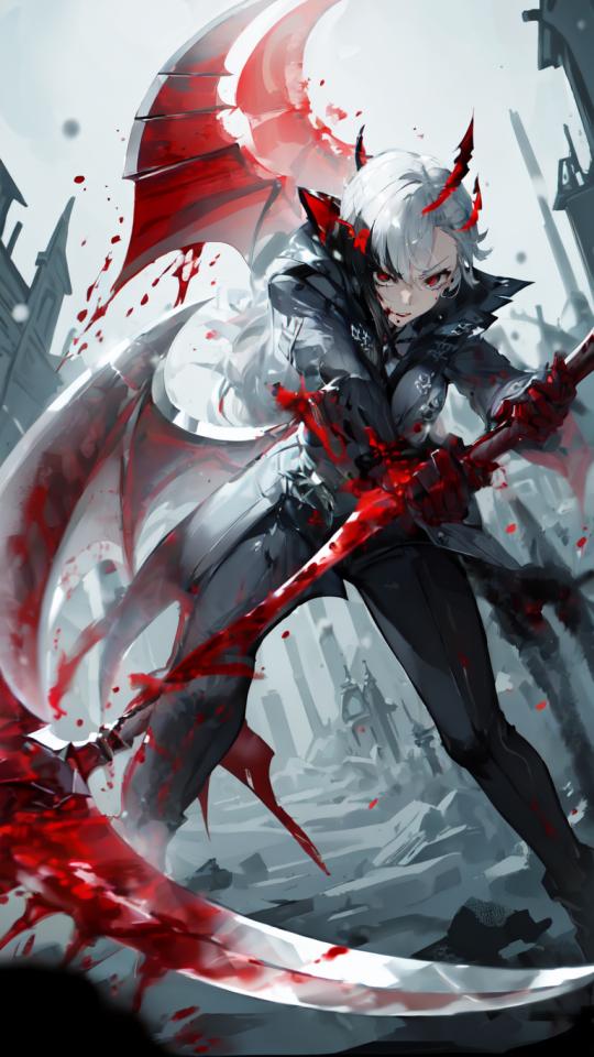 (((blood))),(holding detailed death reaper's bloody red scythe at foreground, red succubus wings wide open:1.2),(red scythe blade at foreground:1.4),