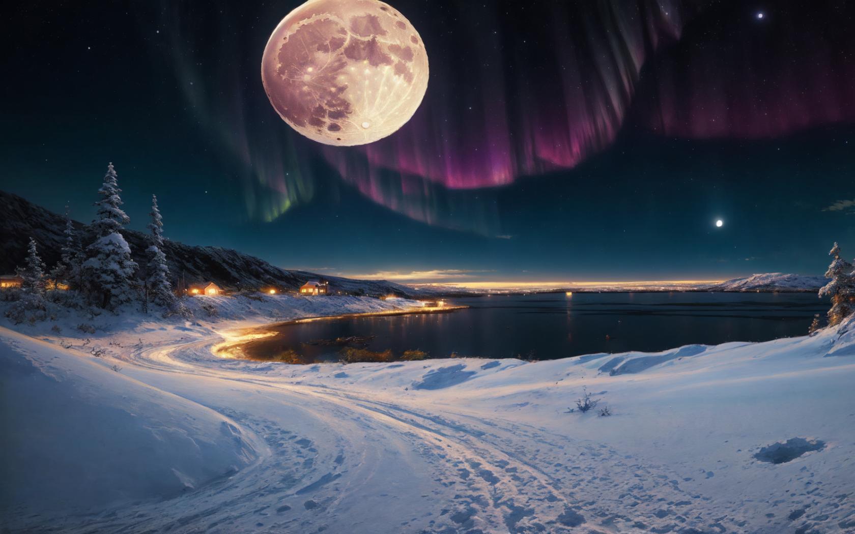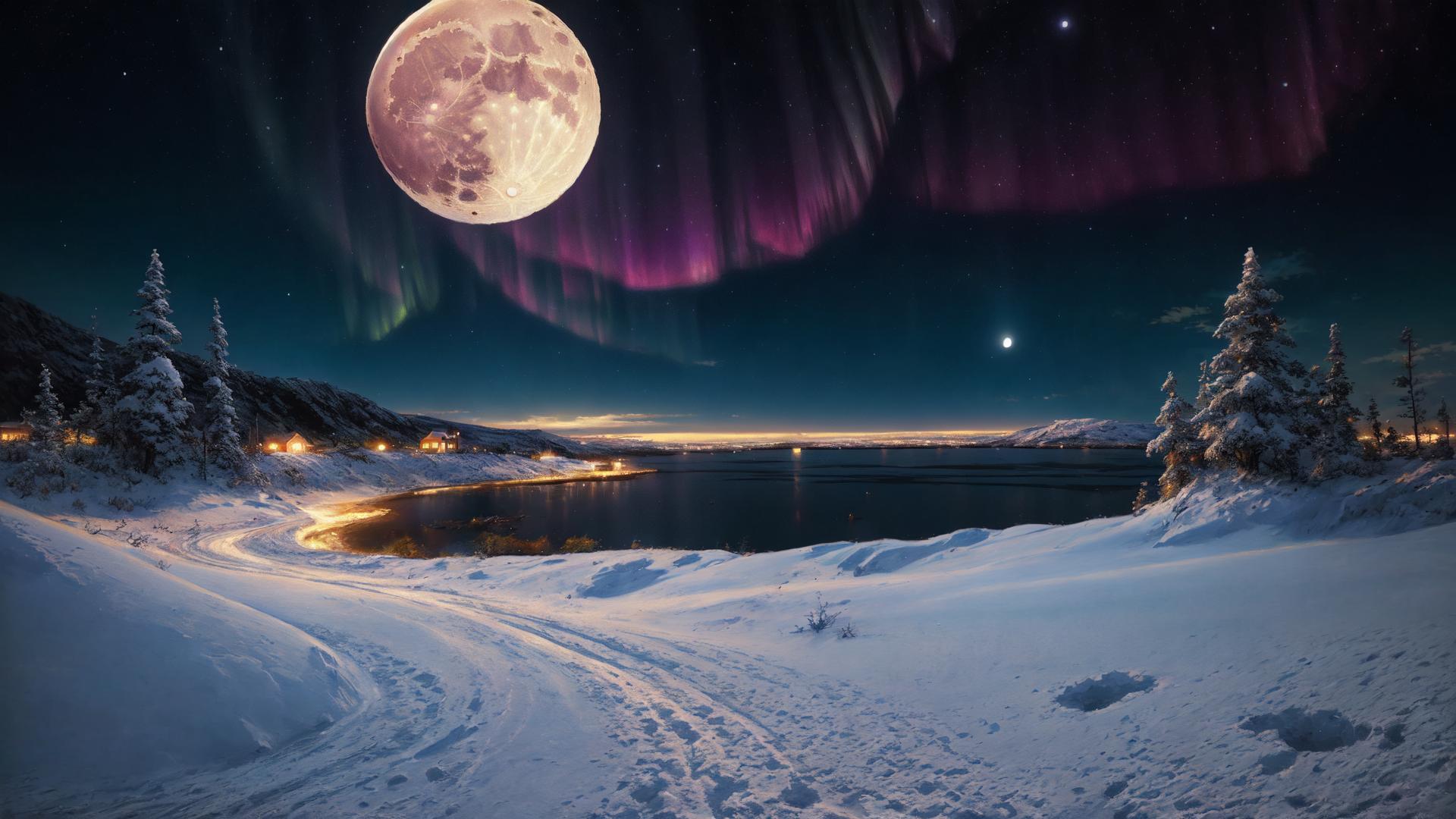 full moon set in a snowy landscape next to mountains and firs with green, pink and purple colored lights above the snow covered hills