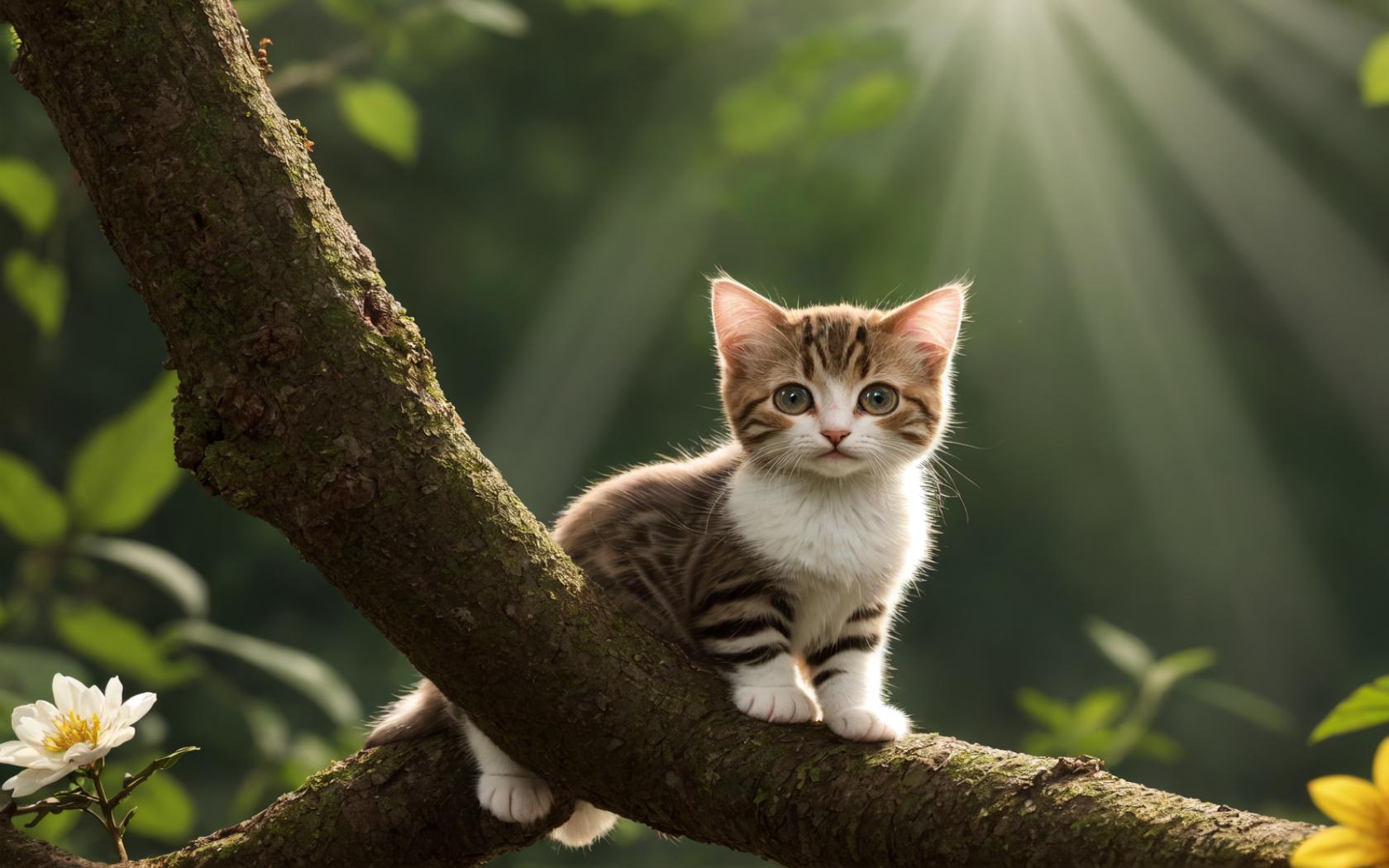 Prompt cute kitten standing on a branch, looking at singing bird, sunrays, foliage, spring,flowers below,