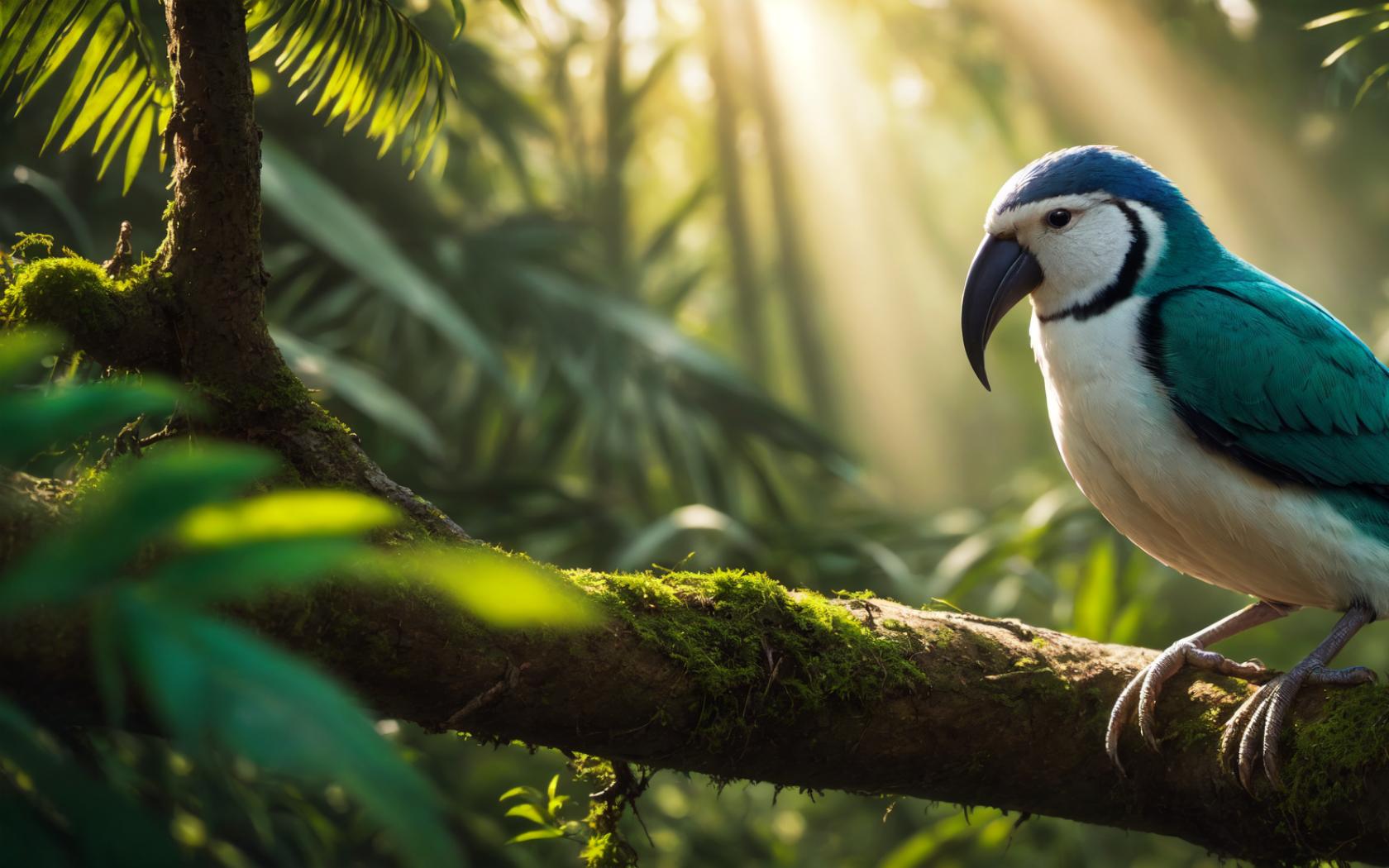 Prompt ((rainforest birds)) sitting on a branch,(animal focus, no humans), above luxurious jungle, moss, liana, sun, sunrays,hot