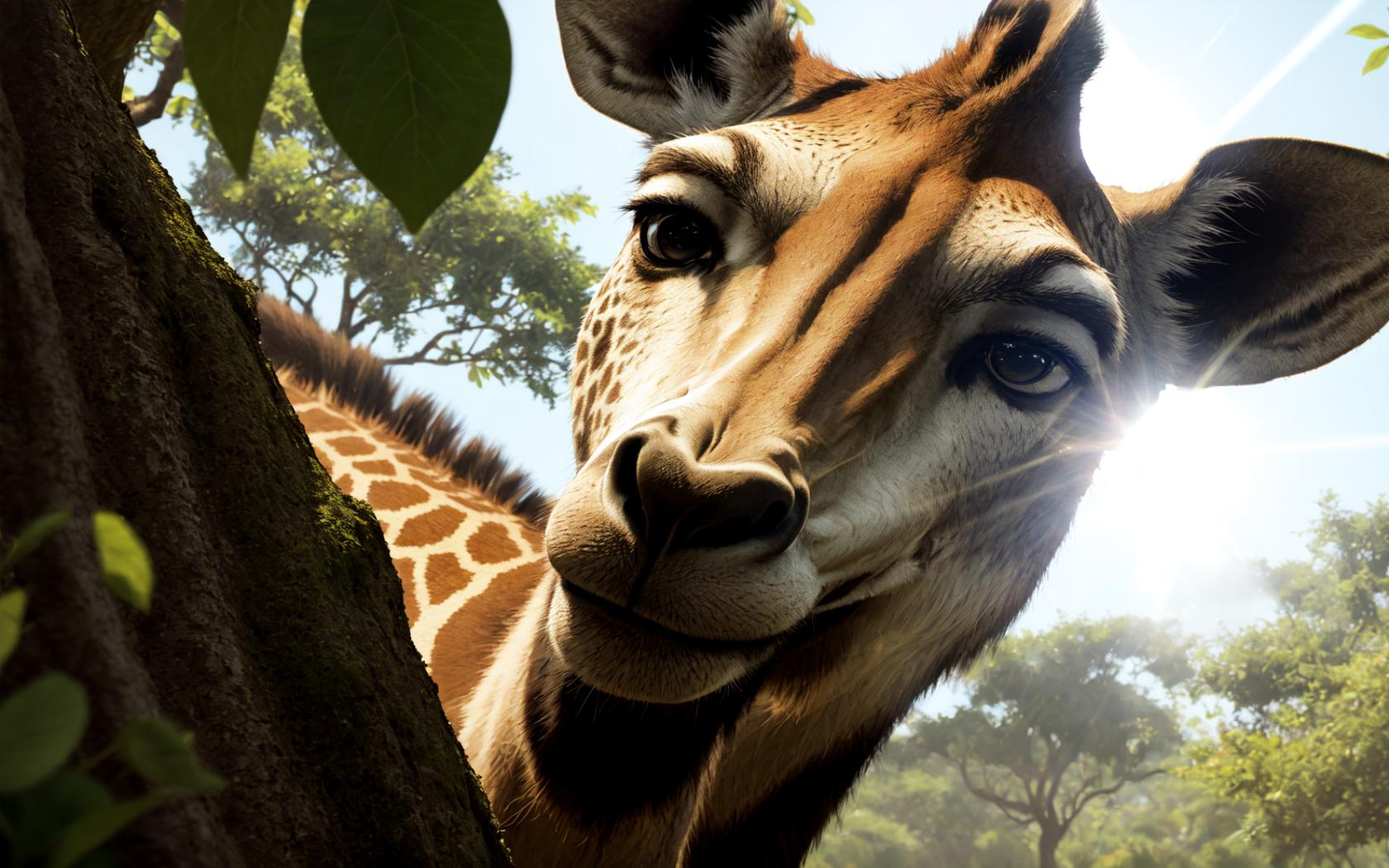 close up photo of giraffe with the camera on its head peering over the branches of the tree looking at the viewer with it's eye