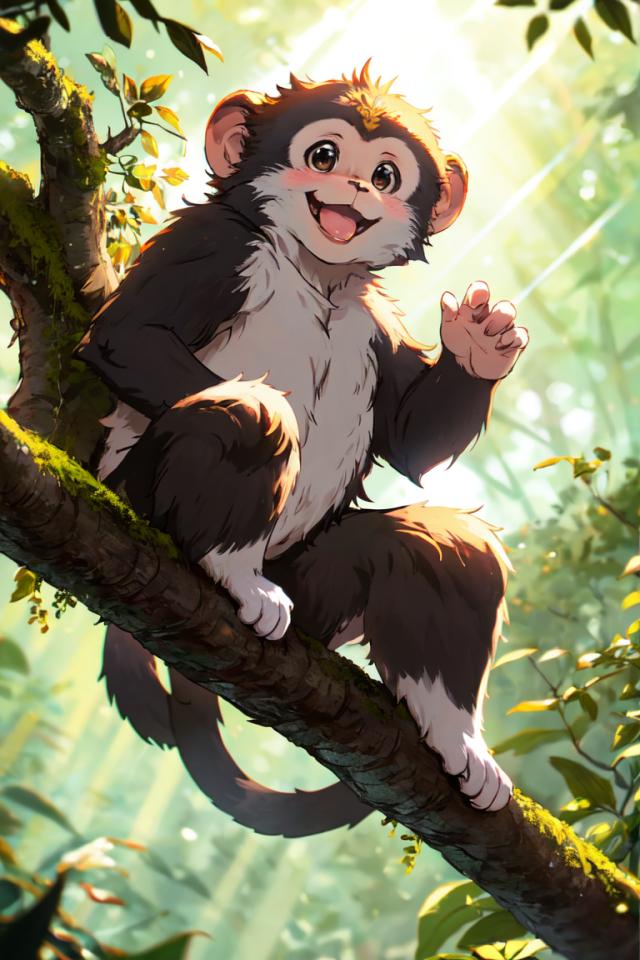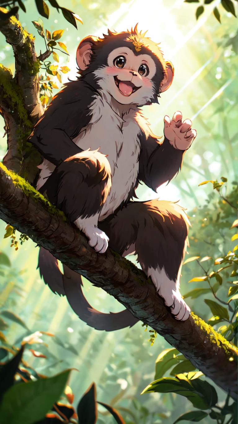 Prompt cute happy monkey sitting on a branch,(animal focus, no humans), above luxurious jungle, moss, liana, sun, sunrays,hot