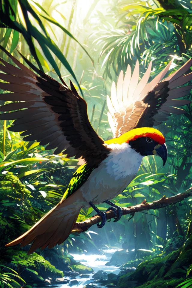 Prompt ((rainforest birds)) sitting on a branch,(animal focus, no humans), above luxurious jungle, moss, liana, sun, sunrays,hot