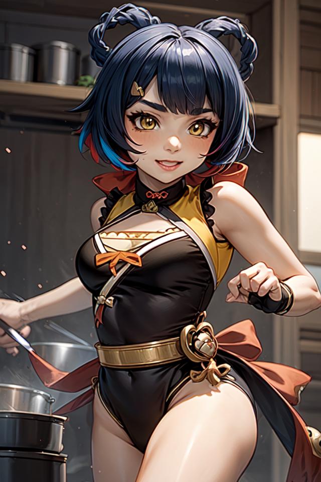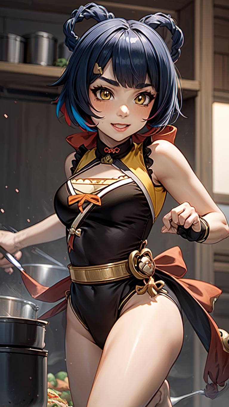 1girl, bangs, bare shoulders, barefoot, belt, black dress, black gloves, blue hair, blush, braid, china dress, chinese clothes, cooking, covered navel, dress, fingerless gloves, food, gloves, grin, groin, hair ornament, hair rings, hairclip, holding, indoors, kitchen , ladle, leotard, looking at viewer, medium breasts, parted lips, pelvic curtain, short hair, sleeveless, sleeveless dress, smile, solo, thick eyebrows, twin braids, vision (genshin impact), yellow eyes