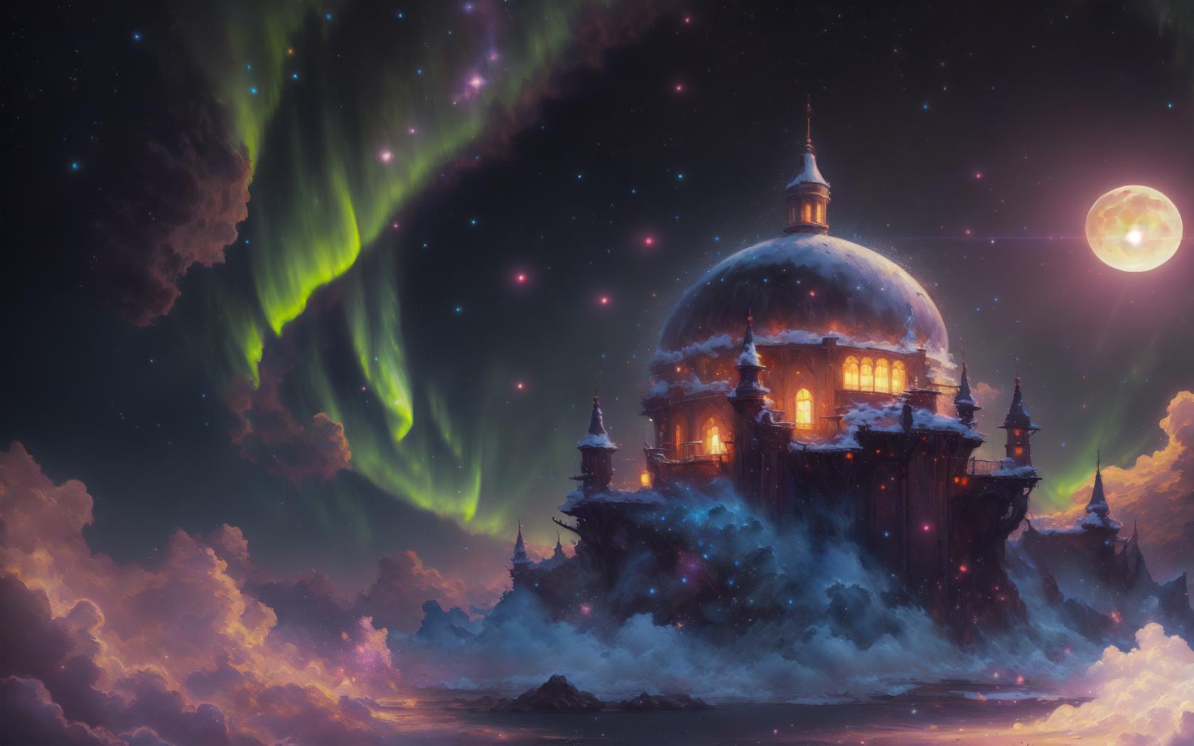 Prompt <lora:Cosmic_Nebula_Style:0.7> martius_nebula, (fantasy full moon rising over fantasy landscape), snow, night,aurora borealis,starry sky,