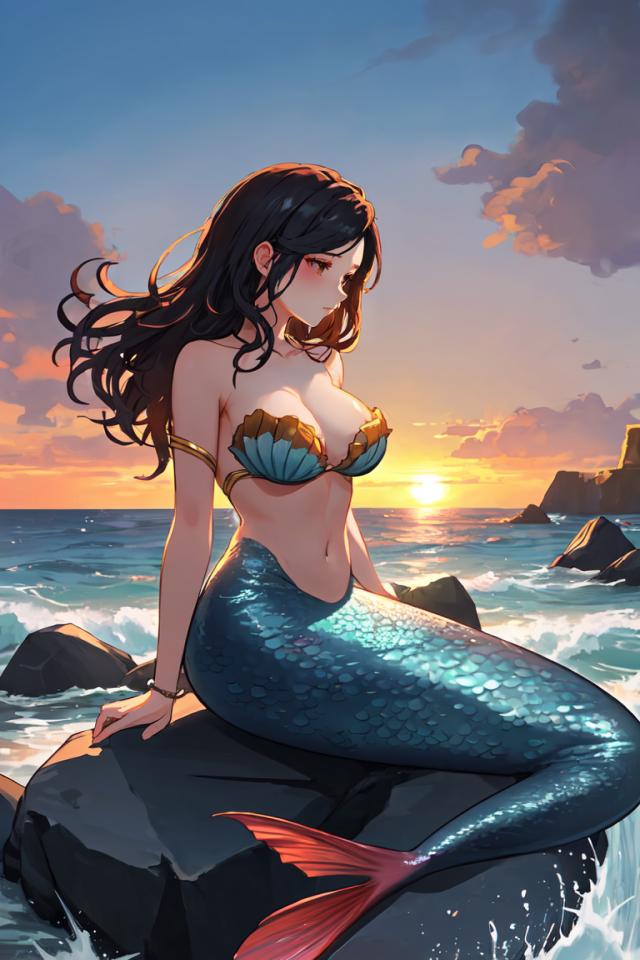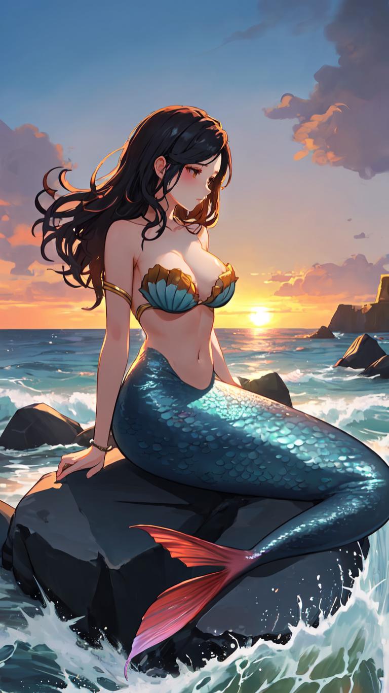 1girl, armlet, bare shoulders, bikini, black hair, blush, bracelet, brown eyes, cleavage, cloud, collarbone, jewelry, large breasts, long hair, looking away, mermaid, monster girl, navel, ocean, outdoors, rock, shell, shell bikini, sitting, sitting on rock , sky, solo, stomach, sunset, swimsuit, water, waves