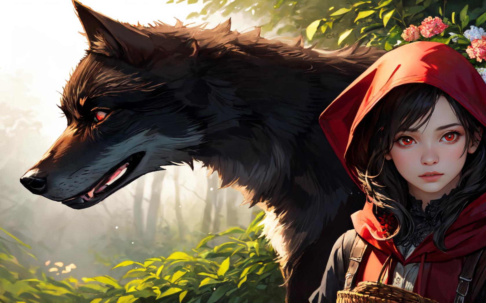 Prompt little red hood, holding basket, woods, flowers, frightening black wolf with red eyes hidden behind a bush,