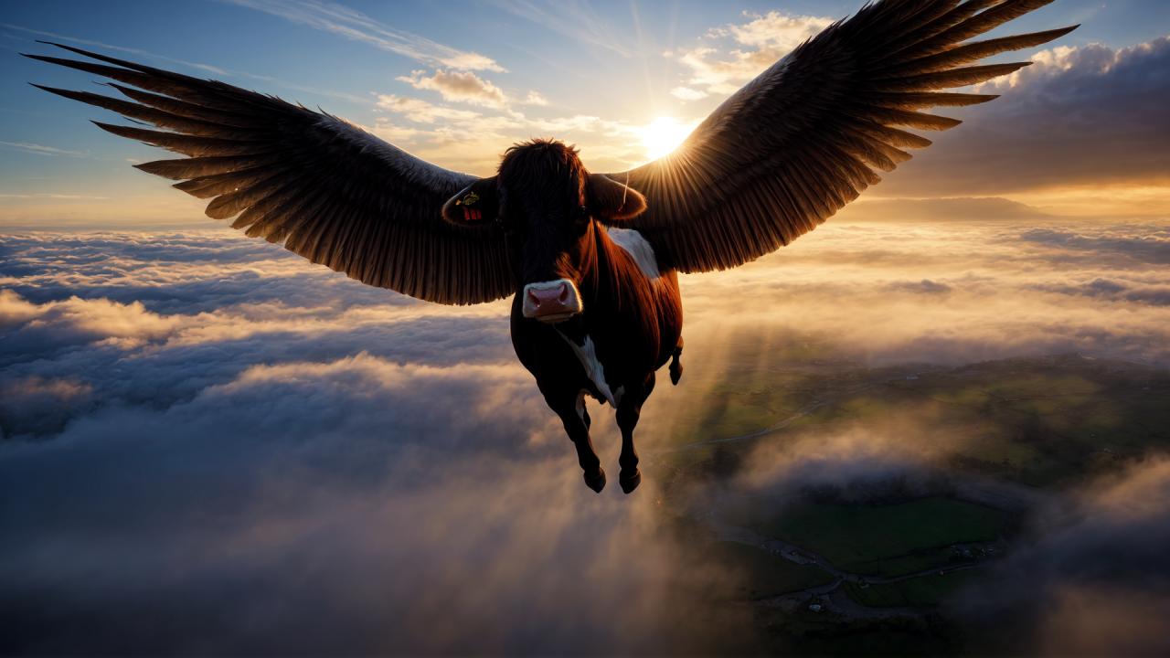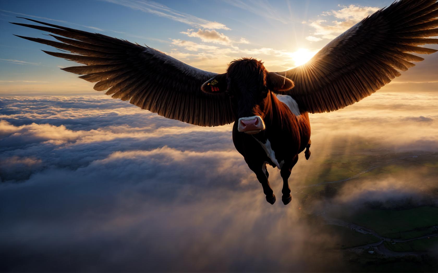 | Prompt | (( winged) cow), (animal focus),
