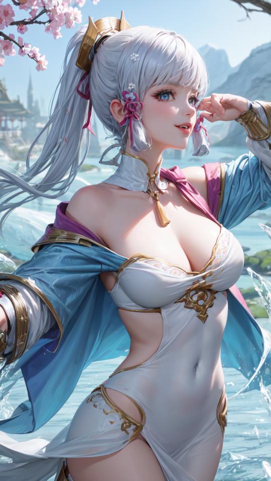 1girl, bangs, bare shoulders, blue eyes, blue jacket, blunt bangs, cleavage, collarbone, covered navel, cowboy shot, day, detached collar, dress, flower knot, gold trim, hair ornament, hair ribbon, hand up, hip vent, jewelry, large breasts, long hair, long sleeves, looking at viewer, medium breasts, mole, mole under eye, neck ring, neck tassel , off shoulder, open mouth, outdoors, parted lips, ponytail, ribbon, side slit, sidelocks, smile, solo, tassel, water, white dress, white hair