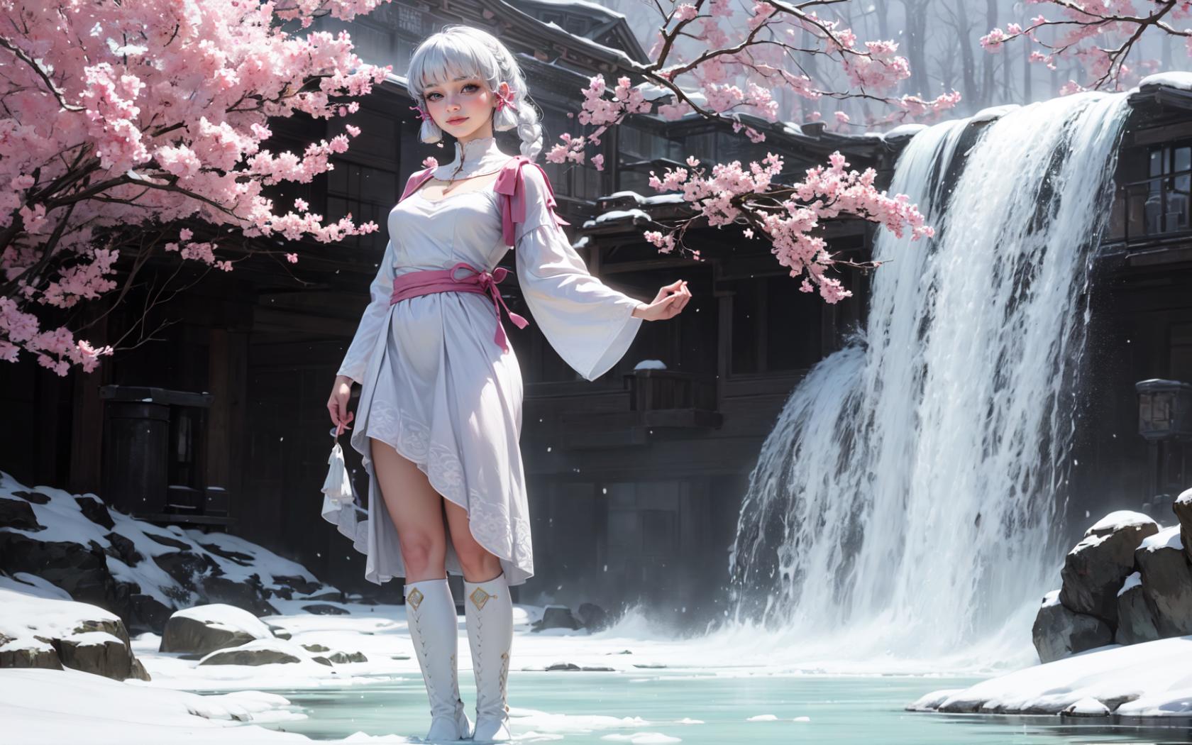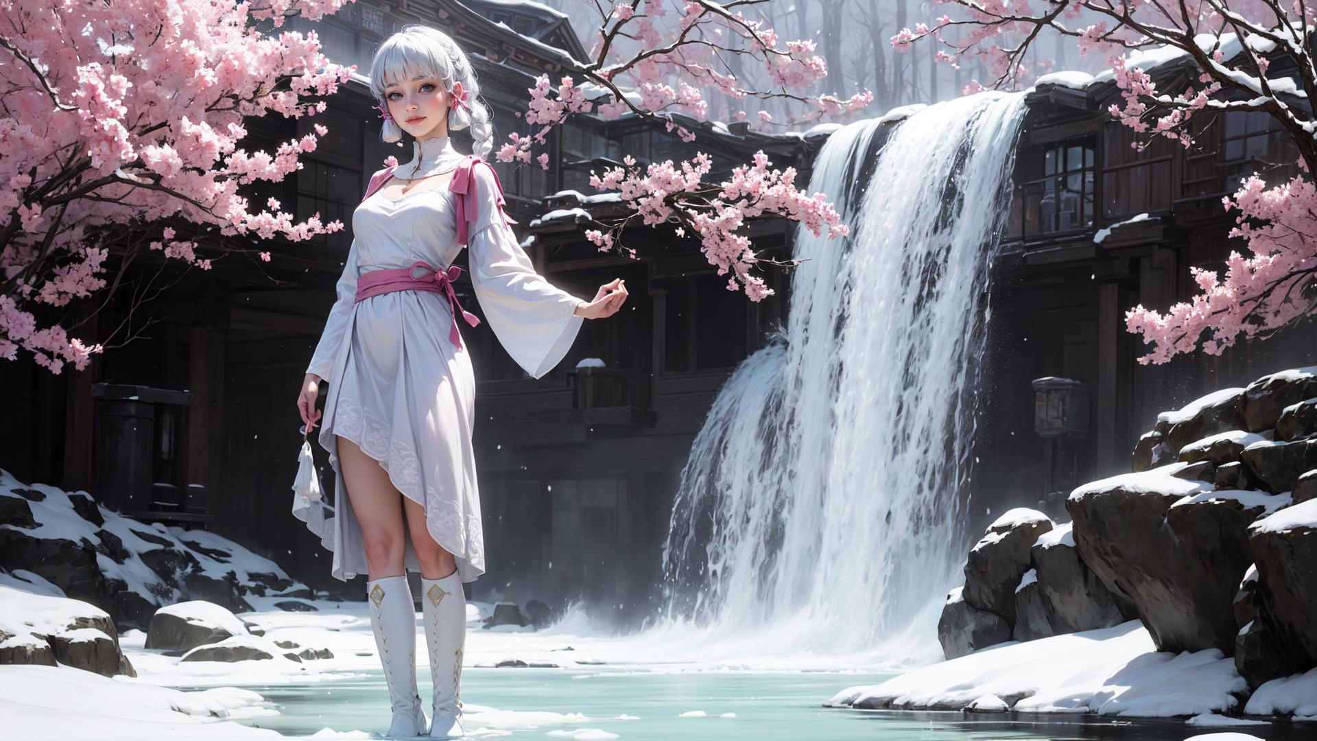 a woman standing next to a waterfall looking out at the sky in the springtime wearing white outfits by a red and pink flowered dress