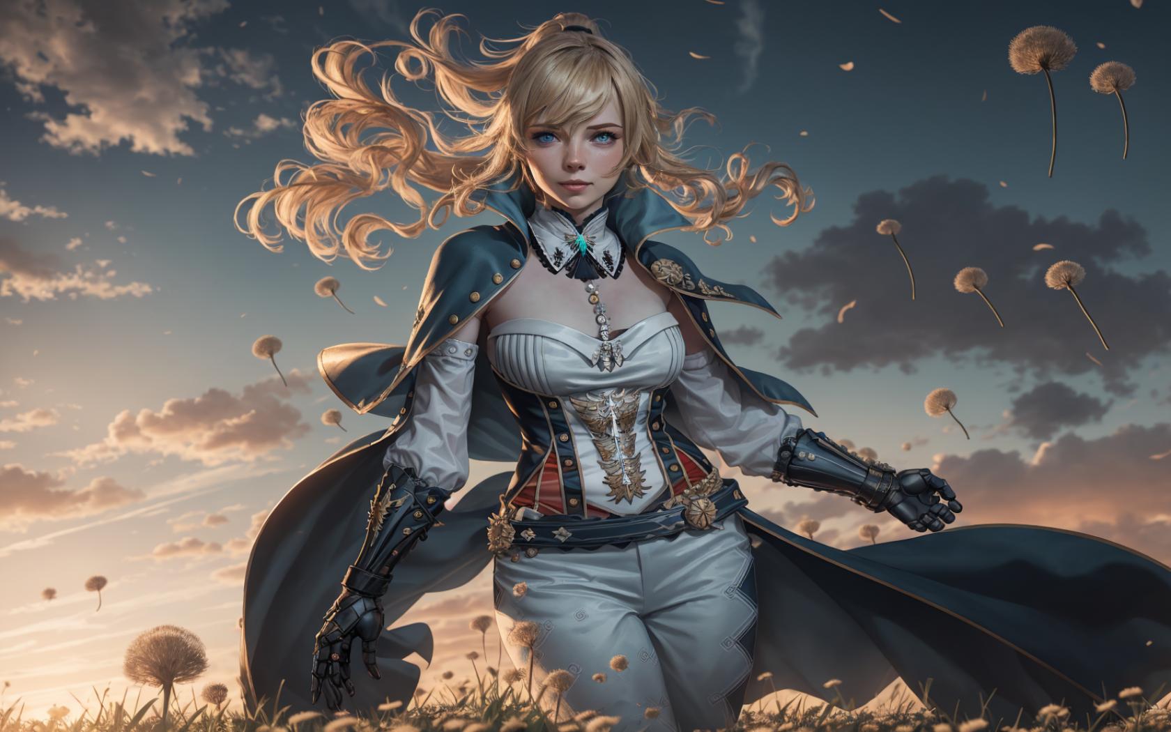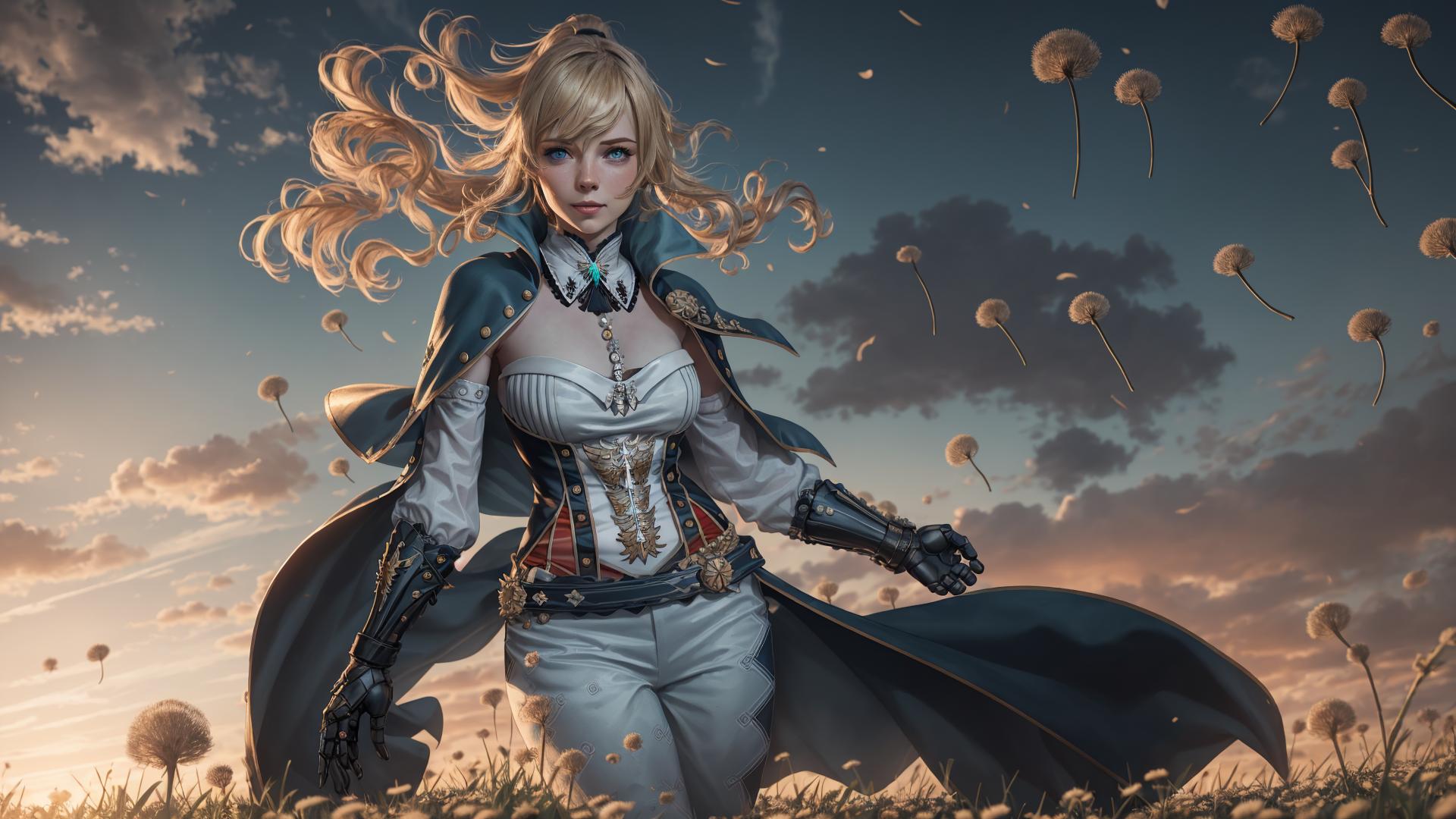 female with a sword stands in a field of dandelions covered with dandelions and blue silk dresses with white tops and beige pants
