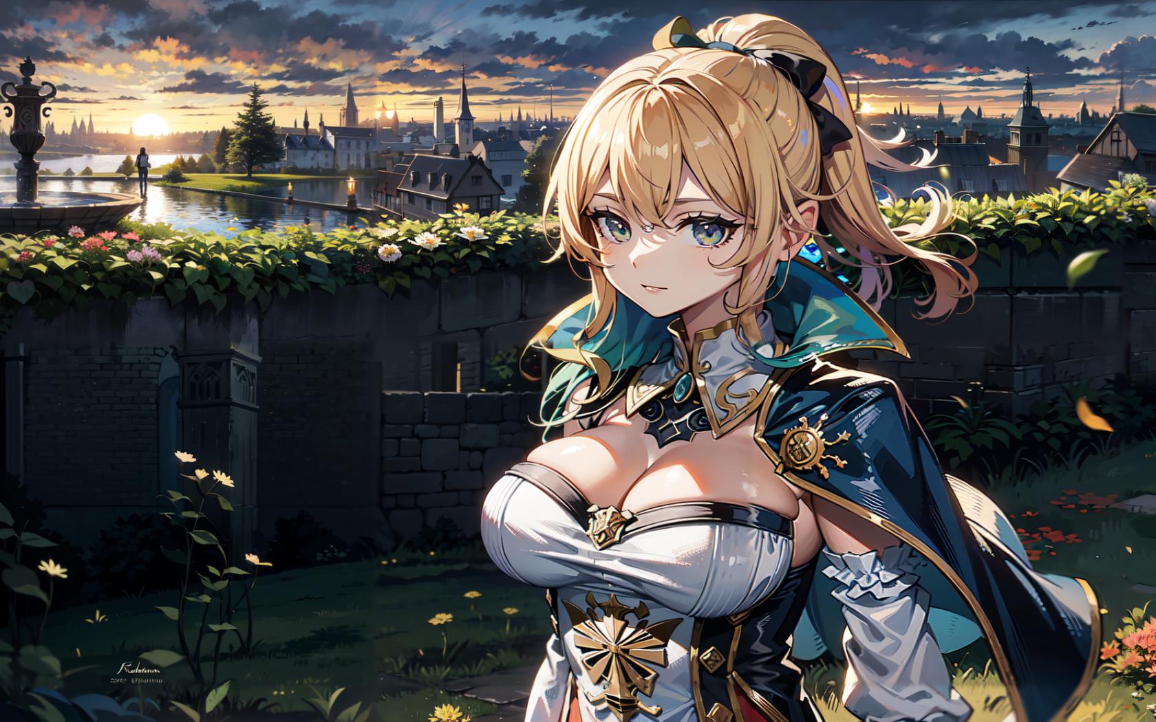 1girl, bangs, black bow, blonde hair, blue capelet, blue eyes, bow, building, capelet, cleavage, closed mouth, cloud, corset, detached collar, detached sleeves, earrings, flower, grass, hair between eyes, hair bow, jewelry, large breasts, long hair, looking at viewer, outdoors, ponytail, scenery, sidelocks, sky, solo, strapless, strapless shirt , sunset, upper body