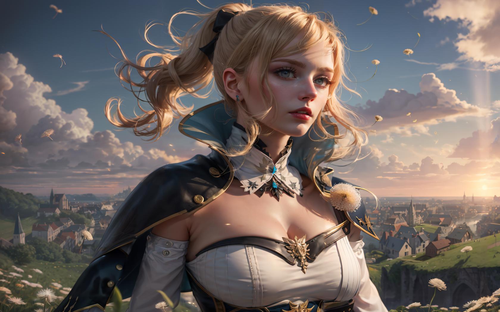 1girl, black bow, blonde hair, blue eyes, blue sky, bow, capelet, cleavage, cloud, corset, dandelion , detached collar, detached sleeves, earrings, hair bow, jewelry, large breasts, long hair, mountain, outdoors, parted lips, ponytail, realistic, scenery, sky, solo, strapless, sunlight, upper body, wind
