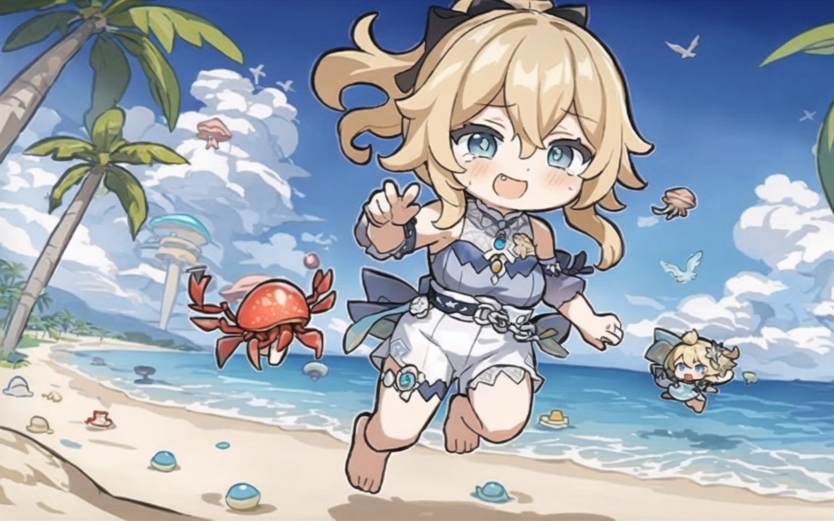 a cartoon anime character running on a sandy beach near a lot of sea monsters at the shore next to a group of young trees and some sand